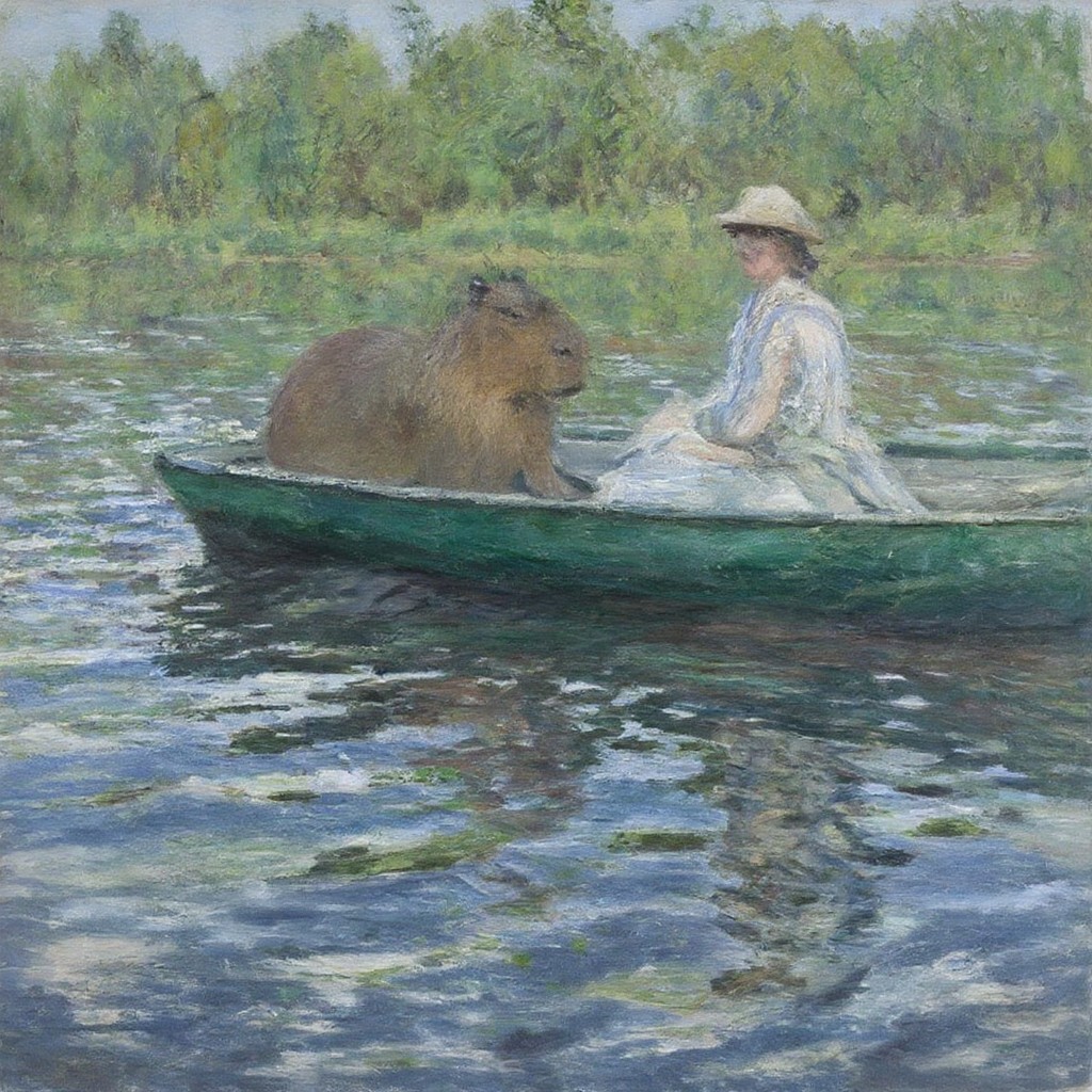 claudemonet1 painting. Two capybara in a small boat on a calm body of water.