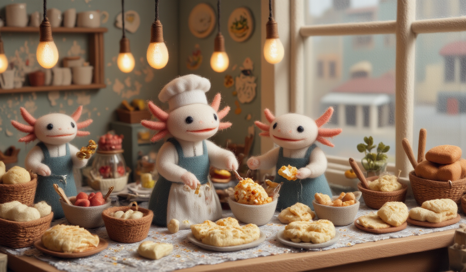 top down tilt shift image of tiny cute felt anthropomorphized axolotls with pink frilly gills and round black eyes, axolotl chef, in a Polish restaurant, cooking pierogi, wearing a traditional Polish apron, comforting and hearty dishes<lora:Axomodel_Flux_V2.safetensors:1.0:1.0> <lora:felt.safetensors:1:1>