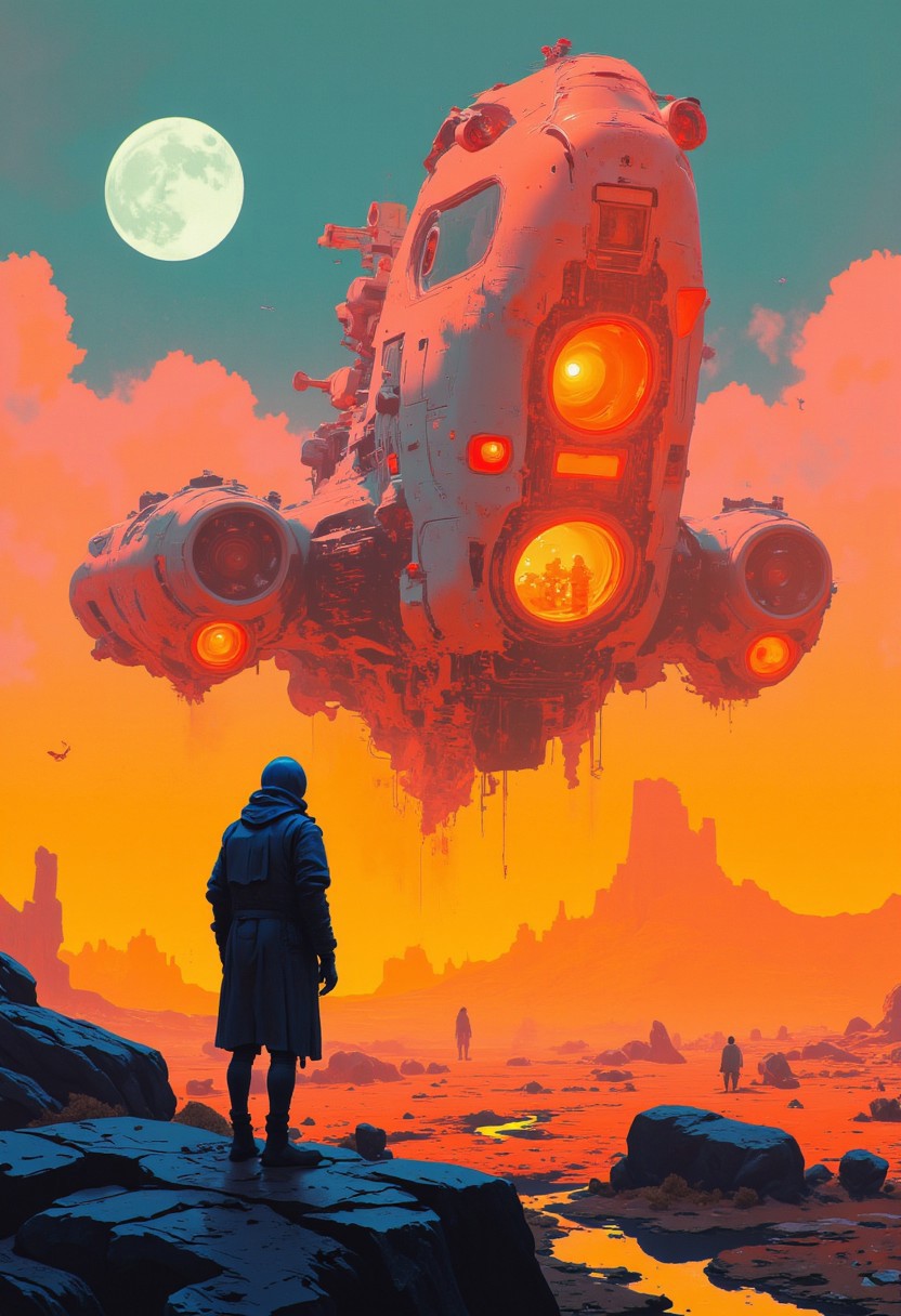 A futuristic, desert-like neon-mist landscape. The central focus is a large, sleek spacecraft with a shape and a smooth, metallic surface. The spacecraft has a large, round cockpit with a bright, glowing light emanating from it. The cockpit is surrounded by a complex array of sensors, antennas, and control panels. In the foreground, on the left, stands a humanoid figure in a futuristic, armored suit with a helmet. The figure is silhouetted against the sun, casting a shadow, and appears to be gazing upward at the spacecraft. The background features a vast, arid desert in dreamlike haze with scattered rocks and a few small, rugged mountains in the distance. Big white moon. Cinematic composition, with a sense of scale that emphasizes the sheer grandeur of the ship against the timeless landscape. highly detailed, high budget, cinemascope, moody, epic, gorgeous, film grain, grainy, Jagged rips in space-time, pulsating with the sickly glow of neon orange, electric blue, or radioactive green, synthetic mist, hiding secrets, silhouettes, and the occasional ghost of the old world.