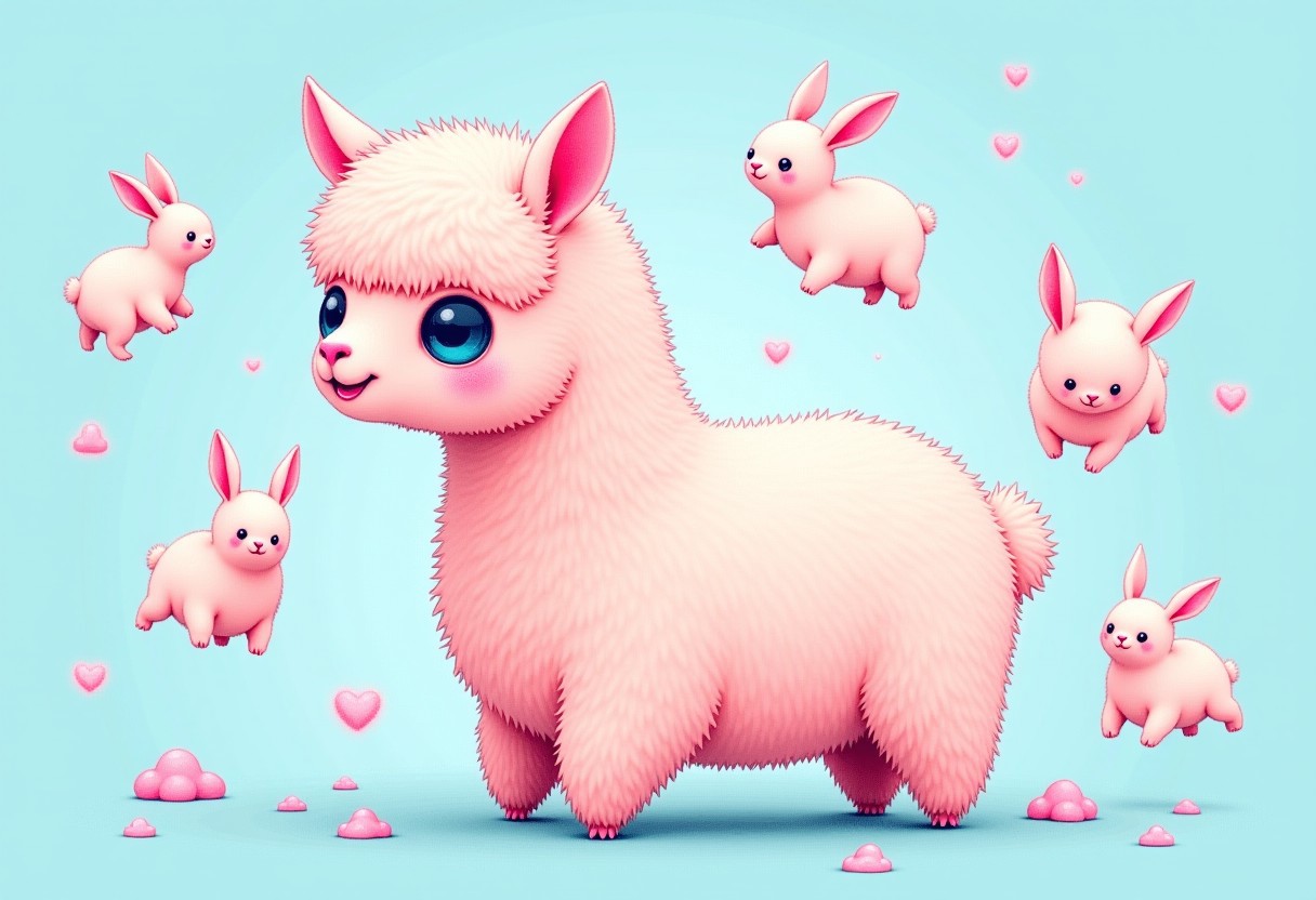 weird and cute illustration of a cute very fluffy baby alpaca with ((bunny like creatures)) floating in the air around it. The bunny creatures are chubby and a bit round. surreal and kind of crazy, funny theme, pink and blue color theme