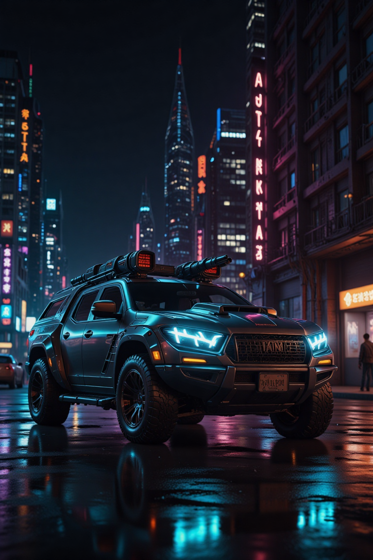 The image is a vibrant, highly detailed CGI rendering of a futuristic urban scene, set in a neon-lit cityscape at night. The focal point is a (high-tech truck armored impressive truck with a laser turret:1.4), with angular, lines and a matte black finish, featuring numerous glowing blue and red accents. The car, equipped with advanced lights and a distinctive, futuristic design, appears to be a concept or prototype model, possibly from a sci-fi movie or video game.