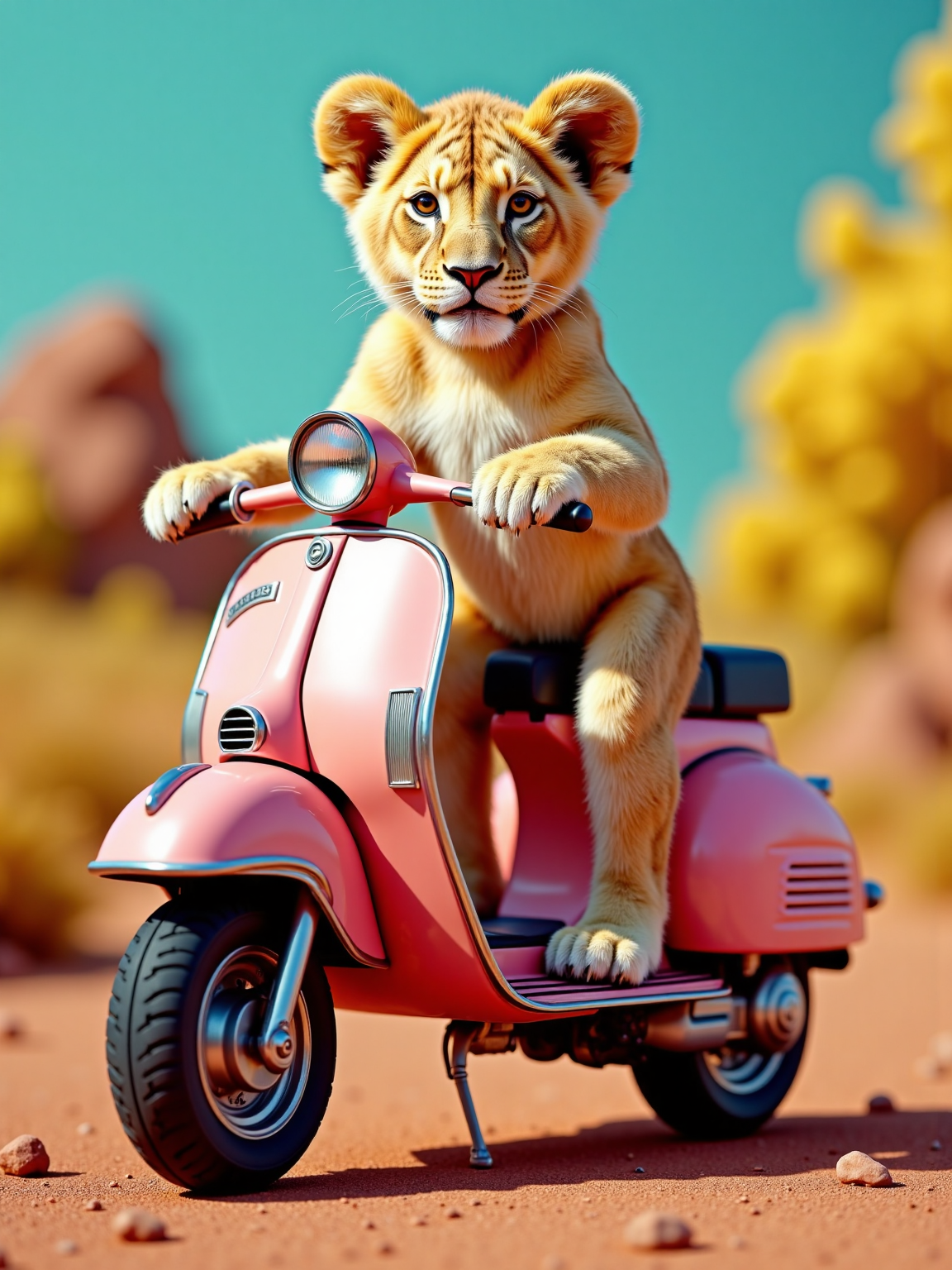realistic photo . anm-frac of a baby lion looking like a a motorbike , Tropical Hues: Coral pink, turquoise, and banana yellow for a vibrant, summery feel, cinematic film still <lora:anm-frac-v1-000048:0.5>