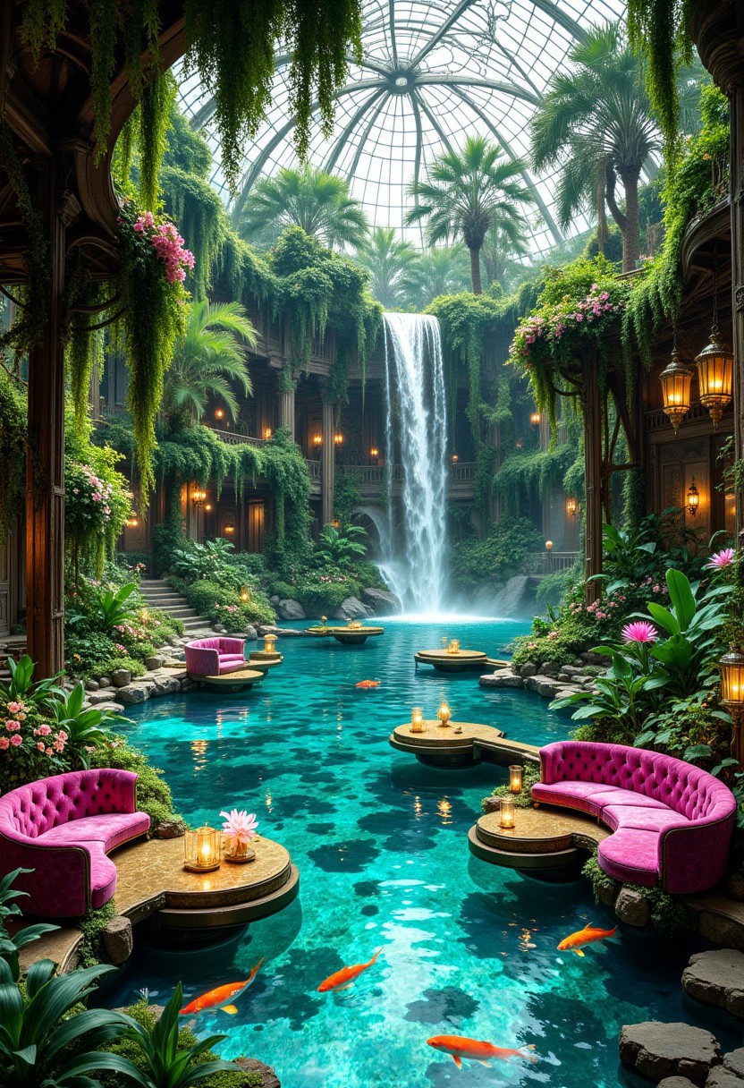 Enchanted Waterfall Ballroom with Floating Lounges A vast botanical garden ballroom, where sunlight filters through towering glass walls, illuminating a space filled with lush greenery and cascading water features. The highlight is a majestic waterfall, gently spilling over a wall covered in moss and flowering vines, forming a tranquil lagoon at the center of the room. Floating on the crystal-clear water are circular platforms, each adorned with magenta and emerald velvet sofas, golden side tables, and plush embroidered cushions. Glass bridges and stepping stones allow guests to move seamlessly between lounge areas, creating the sensation of walking on water. Orchids and jasmine vines drape from an ornate glass-and-iron dome, while hanging lanterns cast a soft golden glow over the shimmering reflections. Delicate koi fish and glowing lotus flowers drift peacefully through the lagoon, adding to the dreamlike ambiance. The air is filled with the scent of fresh florals and mist, creating a serene yet extravagant paradise.