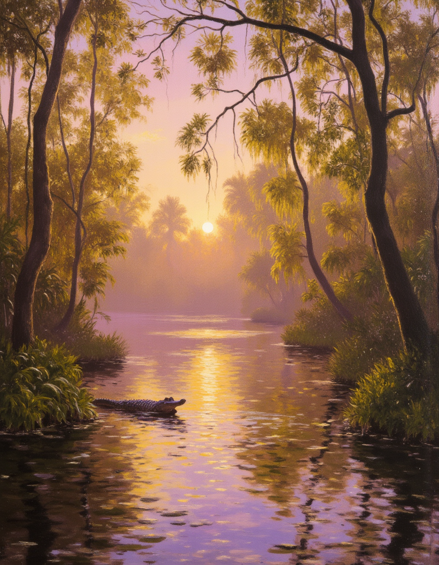 An impressionist-style oil painting of a humid Florida swamp at sunrise, inspired by the atmospheric brushwork of Albert Ernest Backus. The scene captures lush, overgrown swamp land with tall palm trees and tangled foliage, bathed in the warm, golden-pink glow of early morning light. Mist clings to the waterâs surface, diffusing the sunlight and softening the outlines of the landscape. Spanish moss drapes from the trees, swaying gently in the damp breeze. In the foreground, a crocodile emerges subtly from the water, only its eyes and snout visible, creating delicate ripples. Thick, expressive brushstrokes convey the movement of the air, the shimmer of humidity, and the raw, natural atmosphere of the Florida wilderness. <lora:detailer_flux_v1:1> detailerlora <lora:Claude_Monet_Flux-GMR:1> cmca <lora:OBä¸ä¸çºªæ²¹ç»v1.1:0.3> OByouhua, oil painting