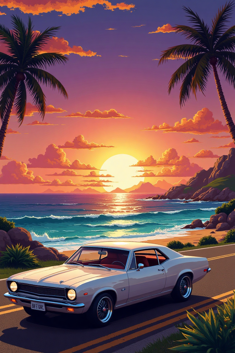 8bit, pixel art, car on a road next to an exotic beach at sunset