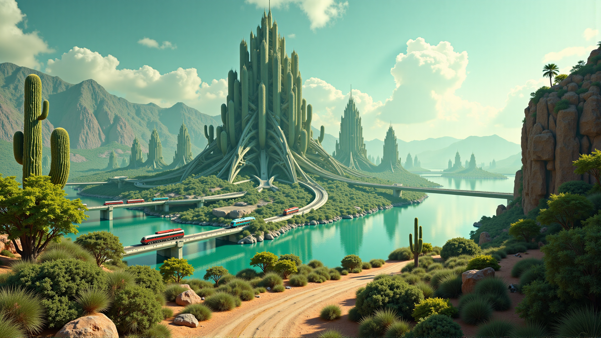 anm-frac of a high detail photo of a huge futuristic high-tech city on a foreign planet. in the center there is a gigantic cactus like structure that streches far into the sky and has glowing lights on various levels. It is a living building. The thorns are platroms. Also big gardens are edged into building. Public transport lines with trains on rails connect the city from every direction and cross the huge lake all around the city. There are huge montains in the background fractal patterns, on an empty dusty road, Cool Greens: Forest green, mint green, and seafoam for a calming, nature-inspired theme, detailed background, highly detailed perfect composition <lora:anm-frac-v1-000022:1>