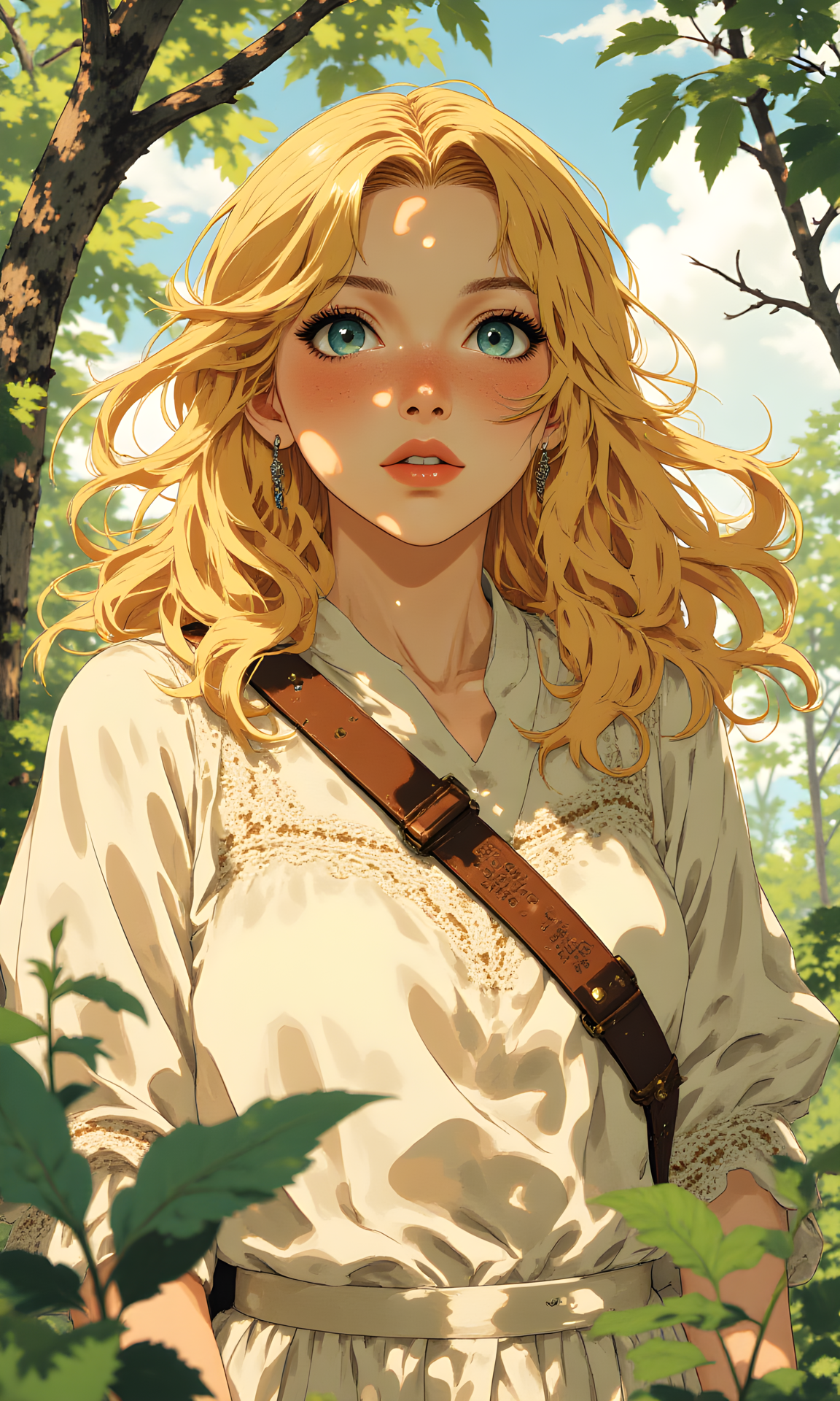 The light is soft and diffused, as though filtered through a canopy of leaves or the gentle haze of a summer afternoon. At the center of this serene setting stands a young woman, her presence both ethereal and grounded. Her hair is a cascade of golden blonde strands, loose and flowing around her shoulders like liquid sunlight. The fine texture of each strand is visible, catching the light in a way that makes them shimmer with an almost otherworldly glow. Her eyes are striking, a vivid shade of blue that seems to hold the very essence of the sky within them. They are wide and expressive, filled with a quiet intensity that suggests she is deeply attuned to her surroundings. Her gaze is direct, meeting the viewerâs with a calm confidence that belies any sense of vulnerability. Freckles dust her cheeks and nose, adding a touch of warmth and natural beauty to her features. Her skin is smooth yet alive, hinting at hours spent under open skies. She wears a delicate garment, likely handmade, with intricate details that speak of craftsmanship and tradition. The fabric is a pale, creamy white, adorned with subtle embroidery and small, sparkling embellishments that catch the light. A brown leather strap crosses her chest, bearing faint inscriptions or symbols that suggest a connection to something ancient or meaningful. The overall effect is one of simplicity and elegance, as though she has stepped out of a storybook where magic and reality blur together. In the background, hints of nature peek throughâa blurred glimpse of branches or vines, perhaps part of a garden or forest. The colors are muted, allowing the woman to stand out as the focal point of the scene. There is a sense of tranquility here, as if time has slowed, leaving only the gentle rustle of leaves and the soft hum of life in the air. Her expression is serene, almost contemplative, as though she is lost in thought or simply basking in the moment. The overall atmosphere is one of timeless beauty, where every detailâthe texture of her hair, the sparkle of her eyes, the intricate patterns on her clothingâcontributes to a portrait of someone who exists in perfect harmony with the world around her. j_art, anime, anime art, <lora:FLUX\jul\J_Anime:0.7>, <lora:FLUX\RealAnime:0.7>
