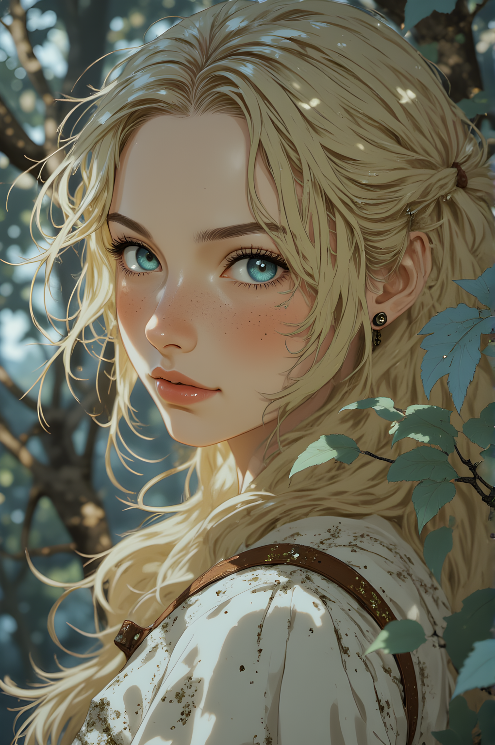 The light is soft and diffused, as though filtered through a canopy of leaves or the gentle haze of a summer afternoon. At the center of this serene setting stands a young woman, her presence both ethereal and grounded. Her hair is a cascade of golden blonde strands, loose and flowing around her shoulders like liquid sunlight. The fine texture of each strand is visible, catching the light in a way that makes them shimmer with an almost otherworldly glow. Her eyes are striking, a vivid shade of blue that seems to hold the very essence of the sky within them. They are wide and expressive, filled with a quiet intensity that suggests she is deeply attuned to her surroundings. Her gaze is direct, meeting the viewerâs with a calm confidence that belies any sense of vulnerability. Freckles dust her cheeks and nose, adding a touch of warmth and natural beauty to her features. Her skin is smooth yet alive, hinting at hours spent under open skies. She wears a delicate garment, likely handmade, with intricate details that speak of craftsmanship and tradition. The fabric is a pale, creamy white, adorned with subtle embroidery and small, sparkling embellishments that catch the light. A brown leather strap crosses her chest, bearing faint inscriptions or symbols that suggest a connection to something ancient or meaningful. The overall effect is one of simplicity and elegance, as though she has stepped out of a storybook where magic and reality blur together. In the background, hints of nature peek throughâa blurred glimpse of branches or vines, perhaps part of a garden or forest. The colors are muted, allowing the woman to stand out as the focal point of the scene. There is a sense of tranquility here, as if time has slowed, leaving only the gentle rustle of leaves and the soft hum of life in the air. Her expression is serene, almost contemplative, as though she is lost in thought or simply basking in the moment. The overall atmosphere is one of timeless beauty, where every detailâthe texture of her hair, the sparkle of her eyes, the intricate patterns on her clothingâcontributes to a portrait of someone who exists in perfect harmony with the world around her. j_art, anime, anime art, <lora:FLUX\jul\J_Anime:0.7>, <lora:FLUX\RealAnime:0.7>