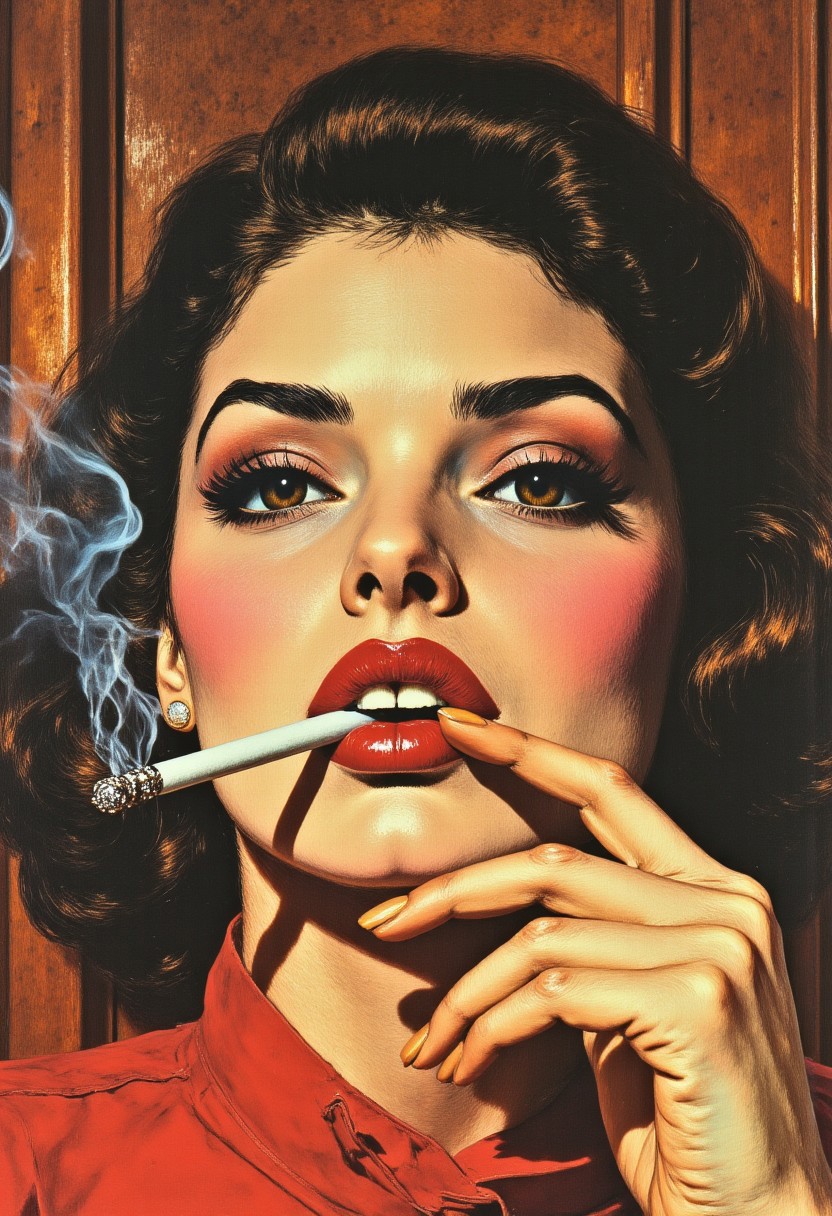 A dramatic close-up portrait of a sophisticated woman in the style of a 1950s tobacco advertisement, shot with warm sepia tones and subtle vignetting around the edges. Her face occupies most of the frame, featuring bold vintage makeup with perfectly arched eyebrows, dramatic winged eyeliner, and rich cherry-red lips carefully applied in the classic cupid's bow shape. Her hair is styled in elegant finger waves or victory rolls, glossy and immaculate. She gazes directly at the viewer with a knowing, confident expression - simultaneously alluring and authoritative. Delicate wisps of tobacco smoke curl artfully around her features, creating graceful arabesques that frame her face. The lighting is classic Hollywood glamour - soft yet dramatically highlighting her cheekbones and the elegant line of her neck. Between her manicured fingers, she holds a cigarette with casual elegance, poised near her lips but not quite touching them. Her jewelry is understated but expensive-looking - perhaps pearl earrings or a simple diamond. The background suggests a sophisticated setting - perhaps the rich wood paneling of an exclusive club or the velvet drapery of a high-end establishment. The composition evokes the glamorous mystique of smoking from an era before health concerns, when tobacco was associated with sophistication, independence, and allure. 80s vintage pulp sci-fi magazine cover,