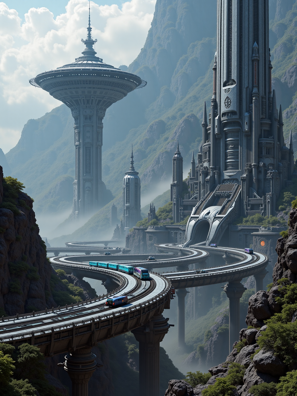 anm-frac of a high detail photo of a huge futuristic high-tech city on a foreign planet. in the center there is a gigantic octopuss from structure that streches far into the sky and has glowing lights on various levels. Also big gardens are edged into building. high speed trains on monorails with blue lights lead to the city and come from a tunel in a big mountain in the distance fractal patterns, in a full train, Industrial Greys: Charcoal, slate, and steel grey for a modern, urban aesthetic, cinematic film still, ultra realistic photograph <lora:anm-frac-v1-000022:1>