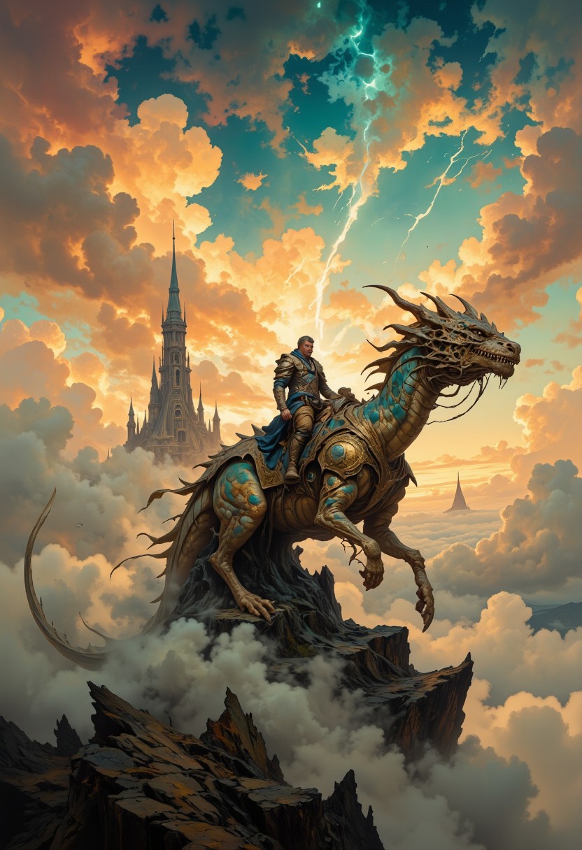 score_9, score_8_up, score_7_up, 8k high quality digital painting, masterpiece, very detailed, ultra realistic, (best quality) very detailed epic masterpiece, unearthly beautiful, full body, boris vallejo style, frank frazetta style, realistic oil painting, retro artstyle, full body, A futuristic warrior rides on a flying dragon above the clouds and looks at a flying sailing ship in the distance that rises above the clouds. Closed cloud cover, above the clouds. The low sun creates long shadows and color effects on the clouds. Backlighting. Romantic, fairytale-like atmosphere. Fantasy. Dreamily beautiful, peaceful, epic scene, warm yellow light, colorful sunset. realistic, full body, Rembrandt style, Vermeer style, realistic realistic, realism, full body, photo realistic oil painting, photo realistic painting