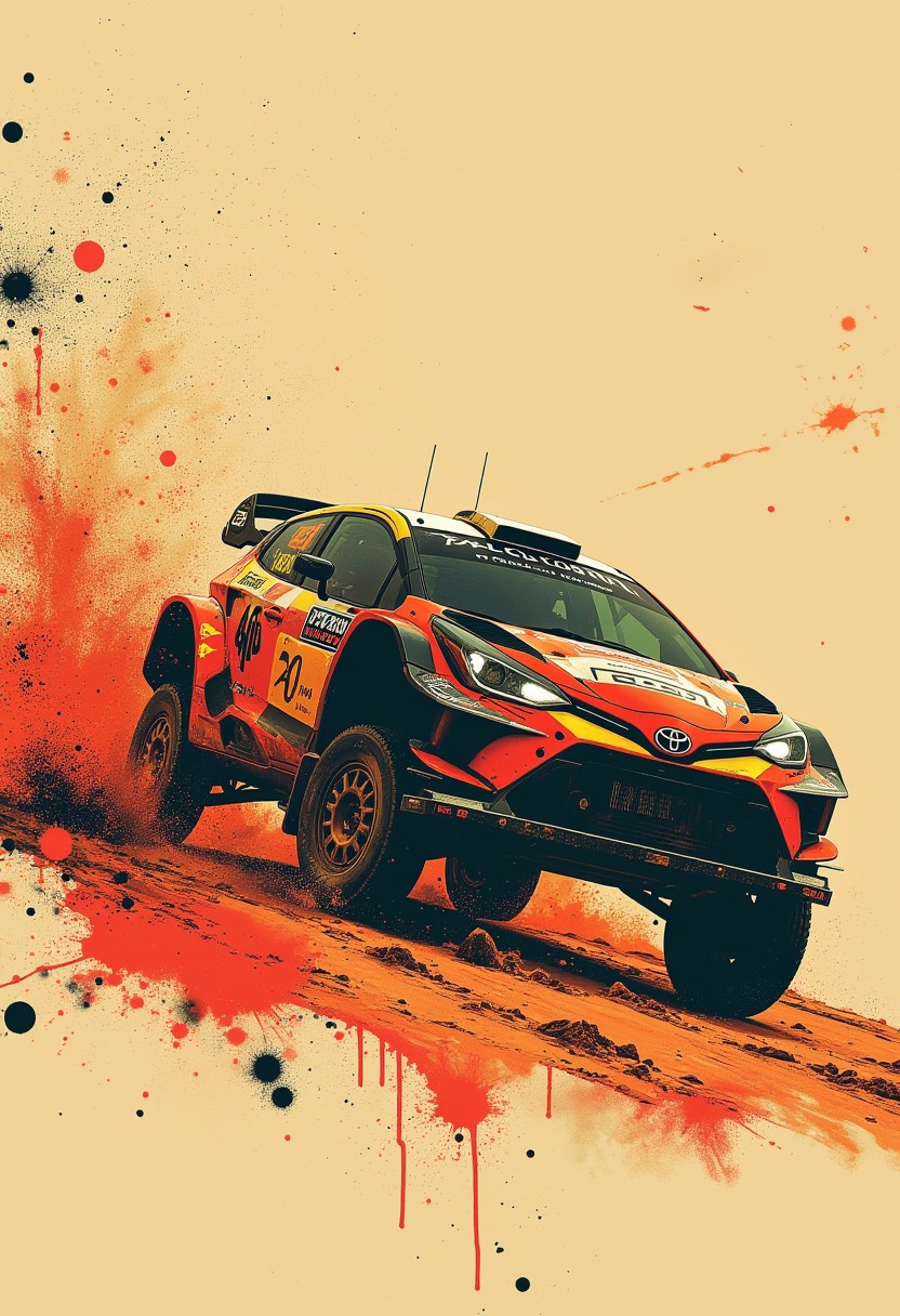 nistyle, Inkplash art on rice paper, sepia, henna , Silhouette Art, magnificent, inksplash poster art, toyota yaris world rally car, number "42", abstract background, dynamic image, dust