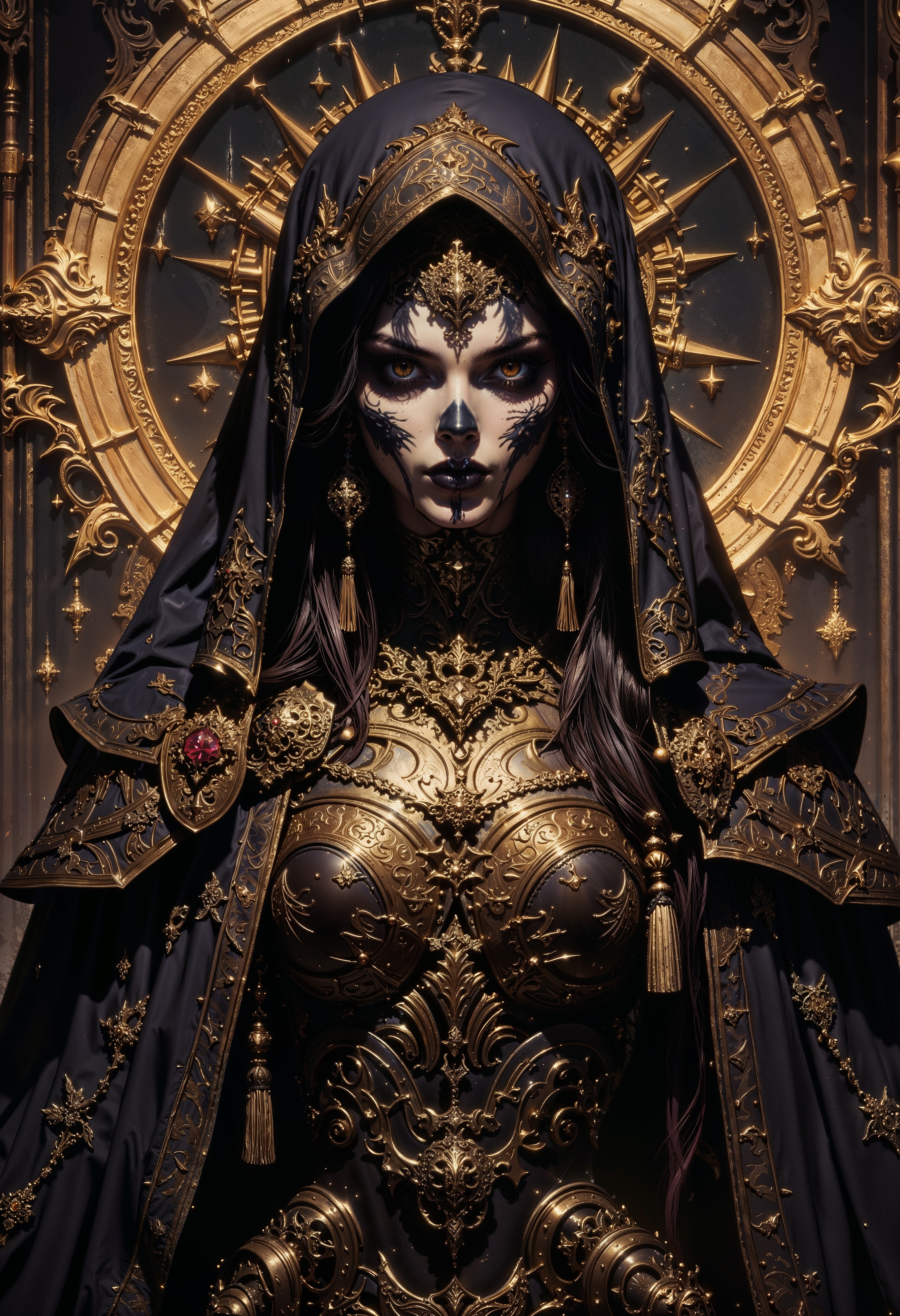 hyperrealism, elven girl, a stunning photo of a gorgeous necromancer female Aerenal Elf, gold and black robes, face warpaint, skull face paint, gorgeous, 8k HD, detailed skin texture, ultra realistic, textured skin,. (maximum ultra high definition image quality and rendering:3), maximum image detail, maximum realistic render, (((ultra realist style))), realist side lighting, , 8K high definition, realist soft lighting, (amazing special effect:3.5) <lora:FluxMythG0thicL1nes:0.6> <lora:RetroAnimeFluxV1:0.6> <lora:FredFraiStyle-FLUX-Share:0.6> <lora:dark_fantasy_flux:0.6>