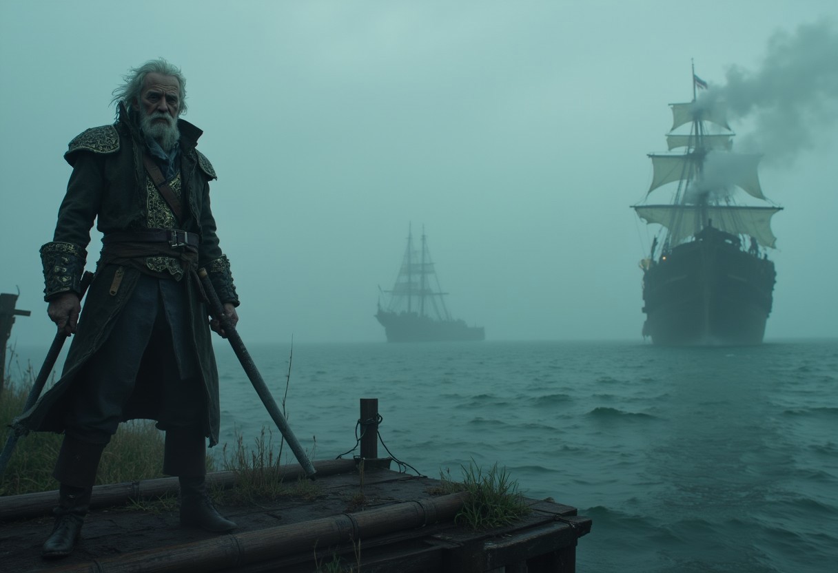ethdysty. The image is a high-resolution cinematic Closeup Face Portrait photograph of an old grumpy fatass in his mid-50s stands at the forefront of a decaying wooden pier, his silhouette sharp and menacing against the fog and flying Spray. His posture is defiant, exuding the cruel confidence of a pirate king, he wears a tattered high collar pirate coat with gold accents, its edges torn from years of battle. His long, snow-white hair and beard whips in the wind, wild and untamed like a storm. His face is sharp, eyes glinting with malice, and a wicked smirk curls at his menace smile resembling demonic madness. A scar runs across his chest and belly, a reminder of countless skirmishes. In the distance, a massive, weathered galley looms on the water, its torn sails and creaking hull barely emerging from the mist. The atmosphere is thick with impending doom, the silence broken only by the distant creaks of the ship, as if the world holds its breath before the arrival of this pirate queen.