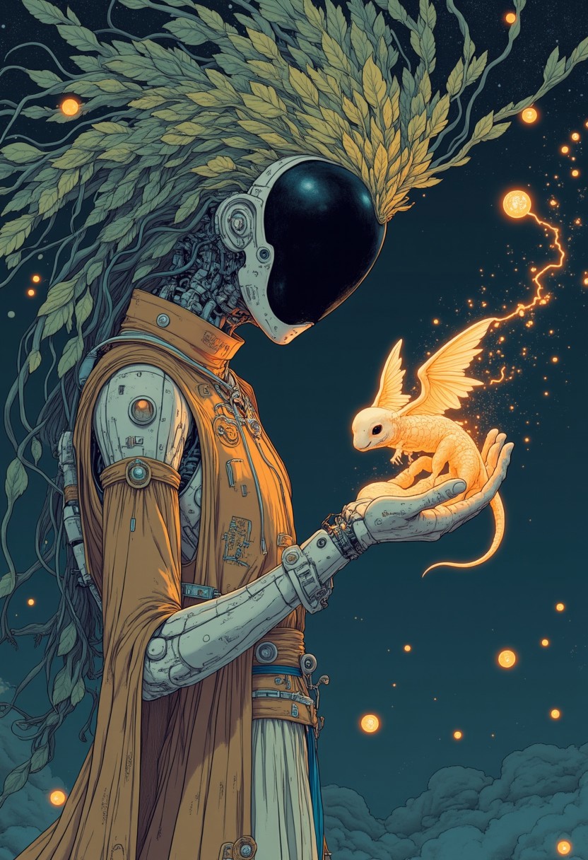 Studio Ghibli Dark Fairytale, Fantasy Illustration , intricate cyborg Portrait of a female Robotic entity with Long billowing Hair Made of leafs, black hollow eerie head, No Face, DARK moody, dfmstyle, A dark fantasy cyborg-knight conjuring a small ethereal dragon in his hand, tendrils of arcane energy swirling around them. His flowing high collar cloak billows in the unseen wind, charged with magical power. The dragon, shimmering with ghostly light, takes form from crackling amber and violet/Yellow energy, its delicate wings unfurling as it gazes at its master. Shadows dance around the sorcerer’s intricate robes, adorned with ancient runes that glow faintly in the dim light. The atmosphere is moody and mysterious, with swirling mist and floating embers adding to the dark fantasy ambiance. Ultra-detailed, cinematic lighting, high-resolution.