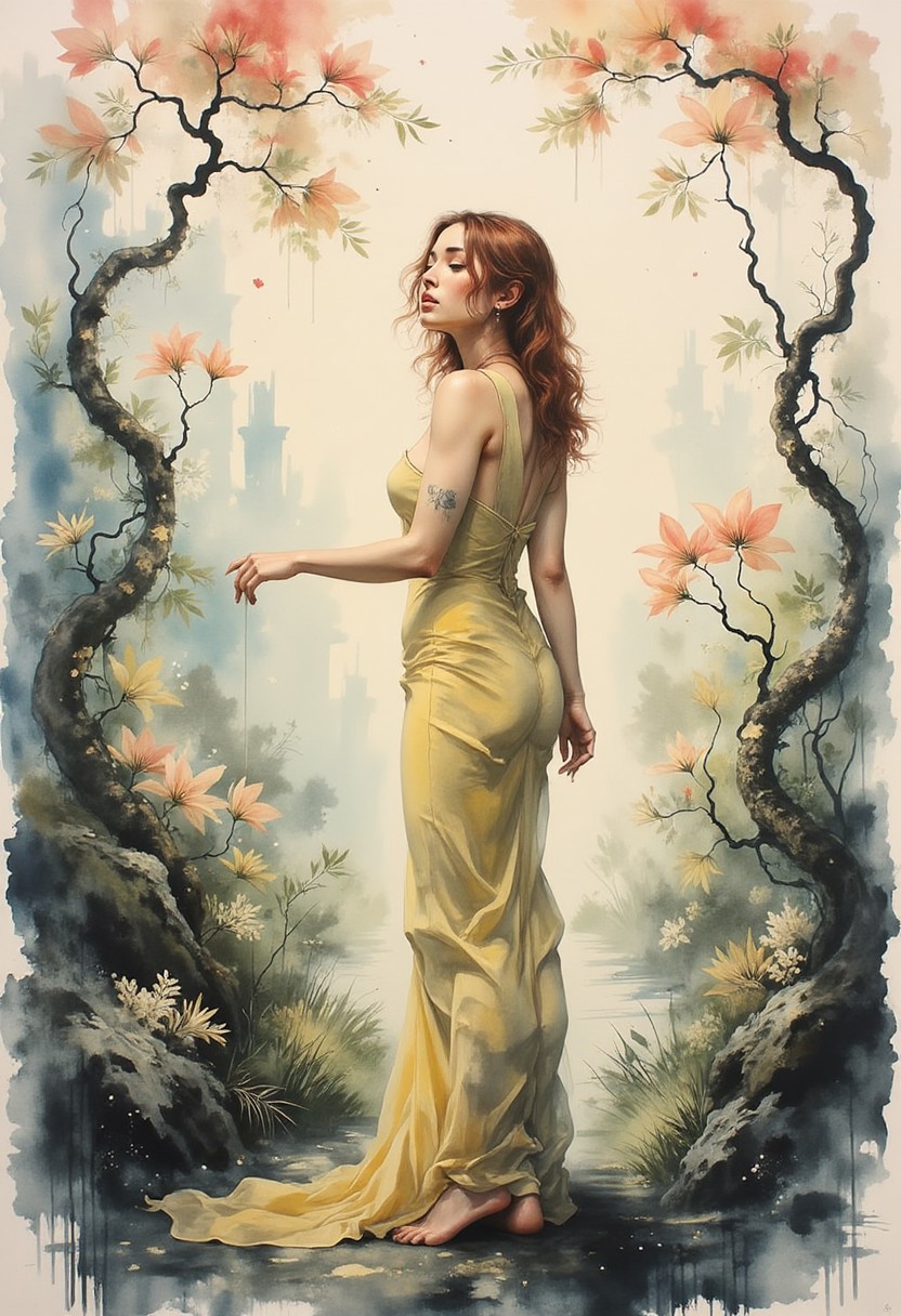 A graceful watercolor portrait of a woman standing in a relaxed, flowing pose, her body curving elegantly as her long hair cascades in soft curls around her. Her expression is serene and dreamlike, her eyes half-closed as if lost in thought as her hands are held out slightly from her hips. She wears a flowing yellow dress with organic, curving patterns. Her hair is red, long and curly, giving her an ethereal, surreal presence. The art style is Art Nouveau, illustrated with graceful, flowing lines and organic curves. The color palette is soft and pastel, blending muted blues, pinks, and golds to create a dreamlike atmosphere. The background is a swirling, abstract landscape, painted with flowing vines, blooming flowers, and arching branches that twist and curl around her. The flowers are holographic, glowing softly, and the vines drift weightlessly, blending natural elegance with digital surrealism. The fusion of flowing Art Nouveau lines with futuristic holographic beauty creates a fluid, magical composition, merging organic elegance with cyberpunk fantasy.