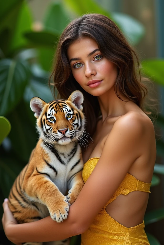 Breathtaking photography of a woman with ultra narrow waist. A portrait of a woman with brown hair and striking green eyes, wearing a long tight-fitting golden dress with a slit on the side. She holds a tiger puppy with striking green eyes in her arms. The background is a zoo. The woman's pose is confident and poised, with her arms gently cradling the cat. The image style is contemporary, emphasizing fashion and beauty., emphasizing the woman's form and the natural beauty of the beach. A candid photo shot of a young woman. (perfectly sharp:1.3), realistic textures, (deep focus:1.5), 8k uhd, dslr, ultra high quality image, film grain, Fujifilm XT3