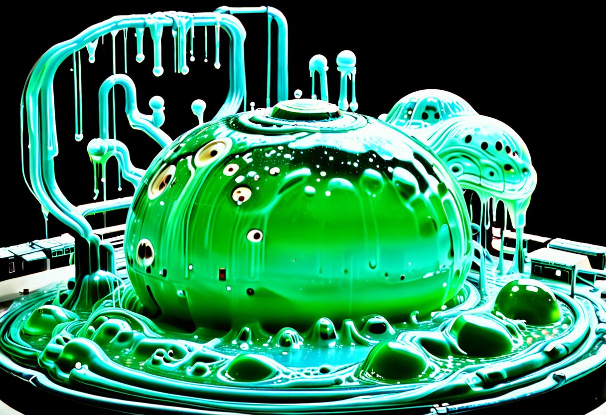 masterpiece, best quality, amazing quality, very aesthetic, absurdres, newest, slime-morph, A space station made of slime, behind a space ship made of slime, solid slime, slime globules fill space