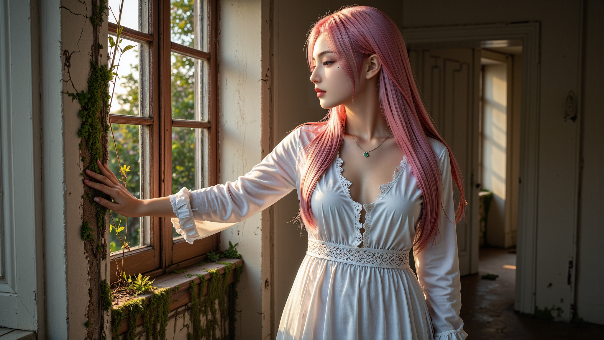 A pink-haired 20-year-old girl,dressed in a white long-sleeved gown,wearing a necklace,gently touches the weathered wall of an abandoned mansion from a bird's-eye view. A soft breeze lifts her hair as autumn leaves swirl around her. The mansionâs walls are cracked and covered in moss,while sunlight filters through the clouds,casting a warm yet mysterious glow. Cinematic lighting,highly detailed realism.,<lora:yuukananri-base-02-flux:0.8>,yuukananri,she has a slender physique and a petite build,<lora:aidmaMJ6.1v0.4:0.5>,aidmaMJ6.1,