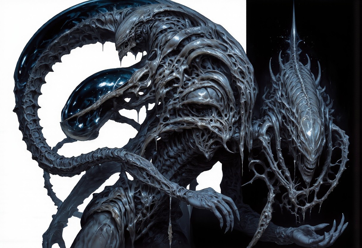 The image features an abstract representation of a skull intertwined with mechanical elements, showcasing a fusion of organic and mechanical forms. The skull has a ghostly, x-ray-like appearance, encased in a transparent, bubble-like structure that emphasizes its intricate details. The contrast between darker and lighter areas creates depth and movement, evoking themes of technology and humanity. The piece, signed “Clear Note” in a subtle script at the bottom right, seamlessly blends anatomical and industrial designs. To incorporate a Xenomorph element into the image, consider adding elongated, biomechanical features characteristic of the creature, such as: 1. **Head Shape**: Alter the skull to feature a more elongated, sleek profile resembling the Xenomorph's distinct head shape. 2. **Texture**: Introduce a glossy, chitinous texture reminiscent of the Xenomorph's exoskeleton on parts of the skull and spine. 3. **Tail**: Add a segmented tail extending from the base of the skull, curling around the mechanical components. 4. **Eyes**: Replace traditional eye sockets with smooth, reflective surfaces to mimic the alien's dark gaze. 5. **Biomechanical Integration**: Blend alien-like limbs or appendages that appear to merge with the existing skeletal and mechanical structures. This composition would maintain the abstract style while enhancing the eerie, alien atmosphere central to the Xenomorph design.