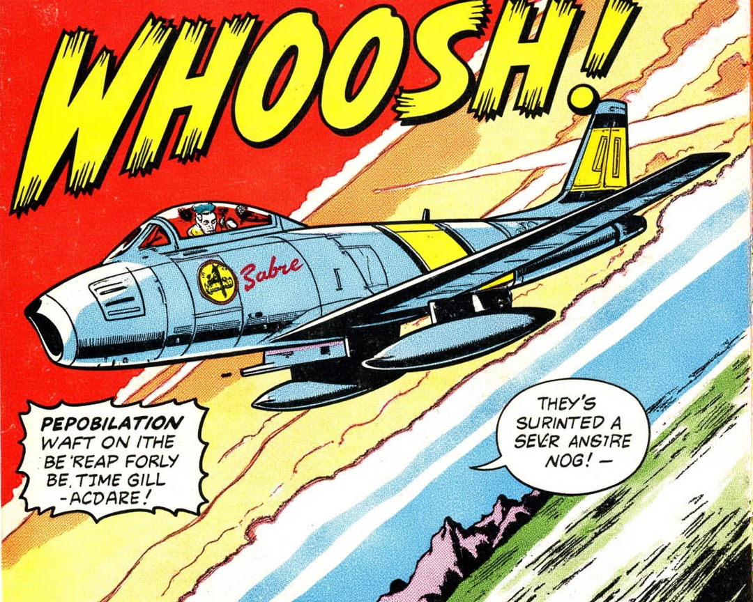 <lora:f-86-sabre-flux-000018:1.0> F-86_Sabre A classic 1950s comic book depiction of an F-86_Sabre battling a MiG-15. The bright colors, exaggerated motion lines, and bold typography bring the intense aerial battle to life. The jet zooms across the page with a dramatic "WHOOSH!" sound effect. Golden Age comic illustration.