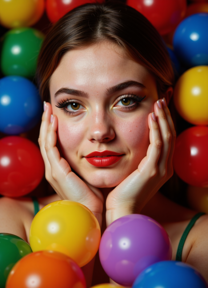 cinematic photo a young woman immersed in a vibrant ball pit, photographed in close-up with artificial front lighting. The subject's face is centered in the frame, with her hands symmetrically placed on her cheeks. She wears dramatic winged eyeliner, defined eyebrows, and red lipstick, while maintaining direct eye contact with the camera. The background is filled with glossy plastic balls in bright primary and secondary colors - red, yellow, green, blue, and purple - creating a playful and visually striking contrast against her serene expression and light skin tone. The shallow depth of field keeps her face in sharp focus while softly blurring the colorful balls surrounding her. Beauty portrait photography with artificial front lighting and shallow depth of field against a colorful background. . 35mm photograph, film, bokeh, professional, 4k, highly detailed