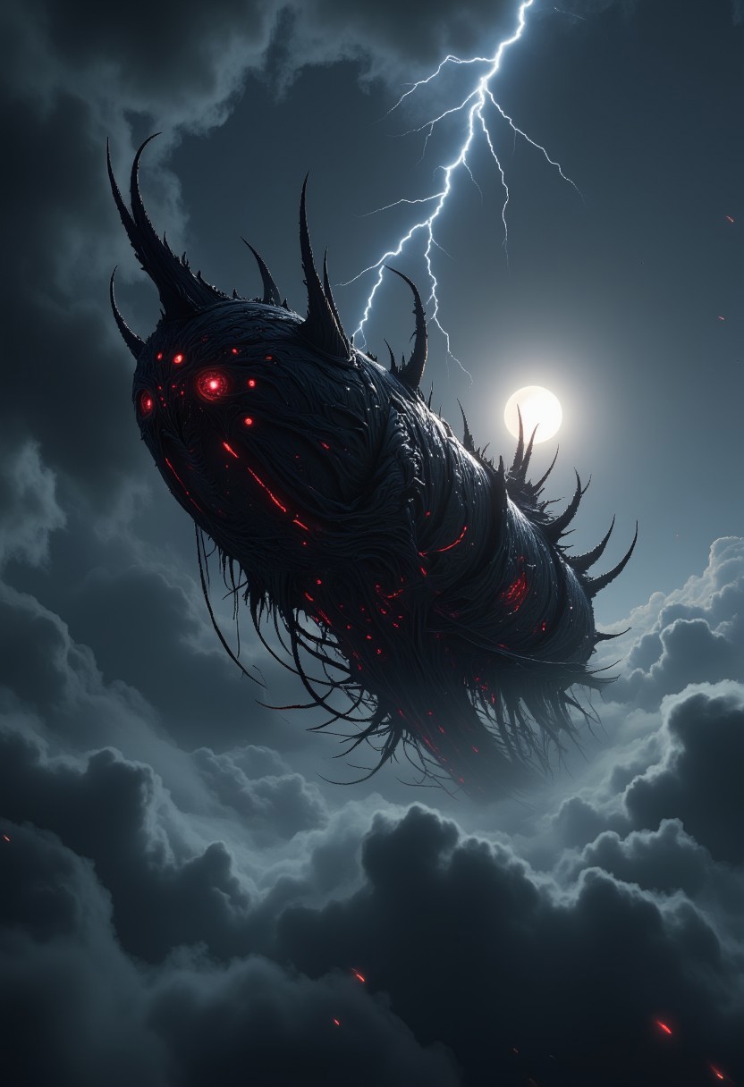 A nightmarish airship, appearing to be a fusion of living flesh and mechanical horror, drifts silently through the cursed skies. Its dark, organic hull pulsates as if breathing, with glowing red veins coursing through its unnatural form. Jagged, insectoid wings, coated in glistening black chitin, extend outward, slicing through the thick storm clouds like blades. Strange, shifting tendrils dangle from the ship’s underbelly, writhing in the chaotic winds below. The eclipsed sun casts a haunting silhouette against the abomination as it moves with an eerie, unnatural grace, an omen of eldritch terror looming over the chaotic, lightning-filled heavens.