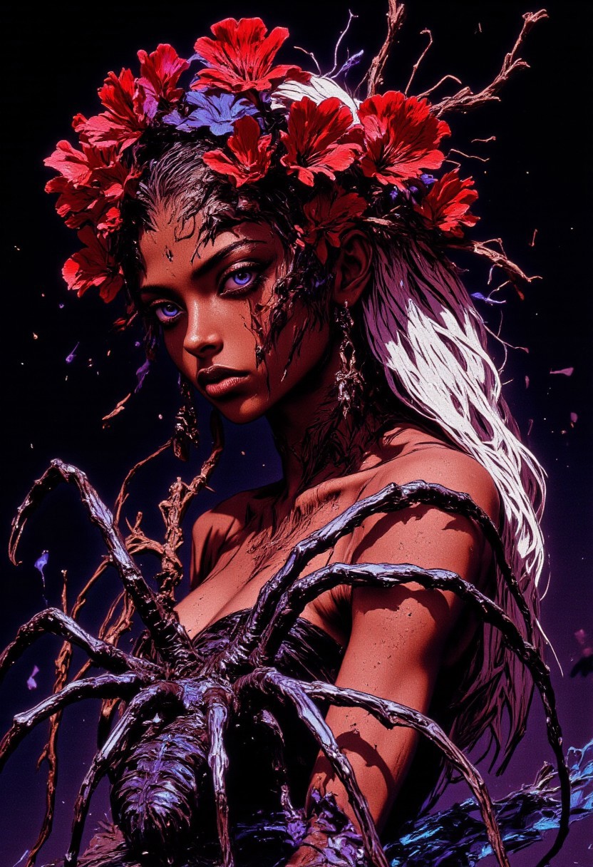 This image is a digital artwork in a dark, mystical, and ethereal style. At the center is a woman with deep bronze skin and long, flowing silver hair. She has large, glowing violet eyes that are almost luminescent, adding a haunting quality to her expression. Her lips are painted an intense black, and a small trickle of dark crimson blood runs down her chin, giving a sinister yet alluring vibe. Her face is adorned with a crown of deep crimson and indigo flowers that seem to be growing from her head, blending into her hair and creating a natural, organic feel. Crawling over her shoulders and across her collarbone is a massive, glossy black centipede with iridescent blue legs, its segmented body curling ominously around her skin. Perched delicately near her neck is a large, violet and black tarantula, its soft, hairy legs contrasting against the smoothness of her skin and the sleek form of the centipede. The background is a deep, dark purple, almost black, with a scattered pattern of small, glowing silver-white dots that give the impression of stars or floating particles. The woman's body appears to be partially submerged in a dark, inky liquid, with her torso and shoulders visible above the surface. The overall composition is rich in texture and depth, with a focus on dark, mysterious, and supernatural themes.
