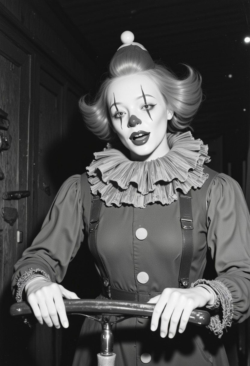 live action found footage, old photo, A series of black and white photos depicting a 'haunted' carnival ride from the 1960s, where ghostly figures were reported. The images show empty cars moving on their own, and a creepy clown animatronic that appears to turn its head to follow the photographer.