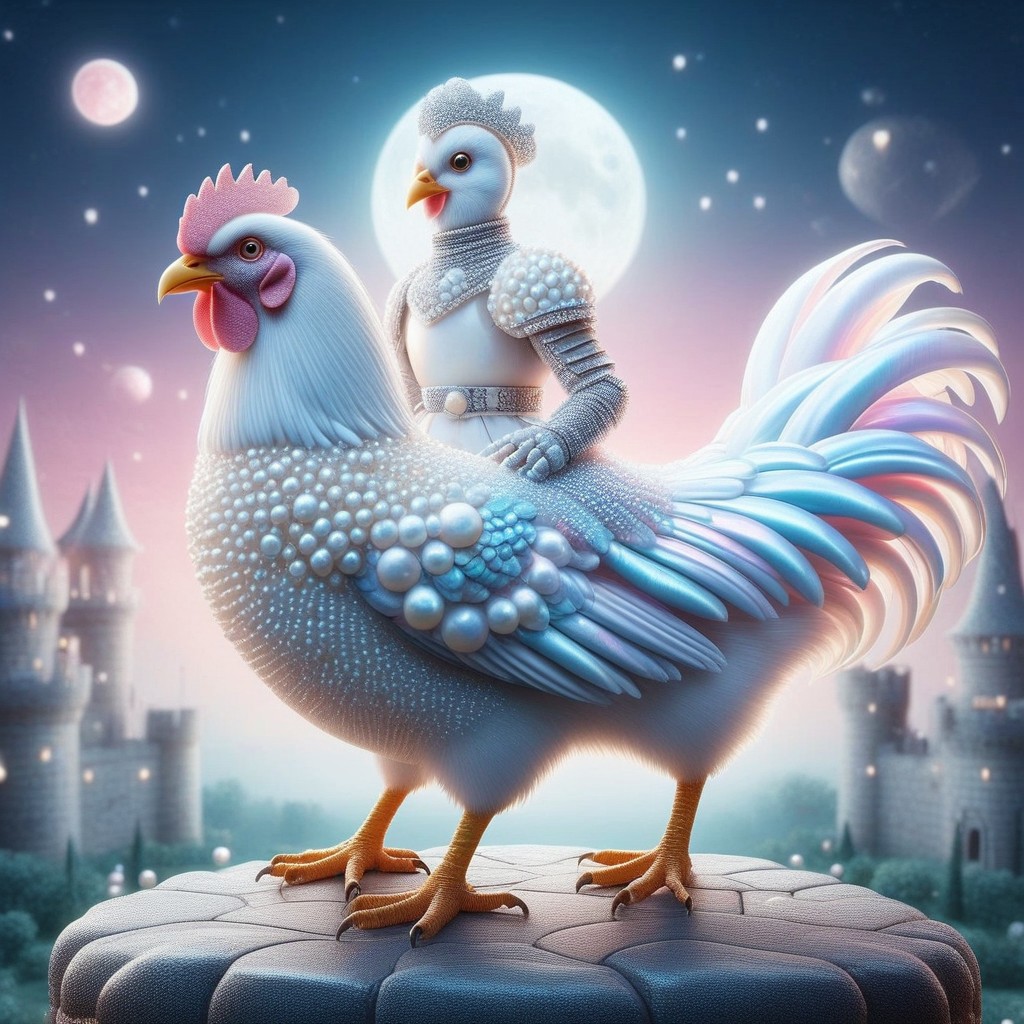 Pearlum, score_10 , score_9, score_8_up, score_8, Masterpiece, High Details, HD, 8K, Photorealistic, perfect, High Quality, whites, reflective surfaces, rainbow colors, ethereal glow, an light blue and white armored knight is riding a chicken, sitting over chicken, chicken made out of Pearlum, light blue and light pink chicken, light blue and light pink armor, armor made out of Pearlum, night background, moon, Pearlum textures, riding a chicken, knight over a chicken, realistic castle, castle made out of Pearlum, castle background