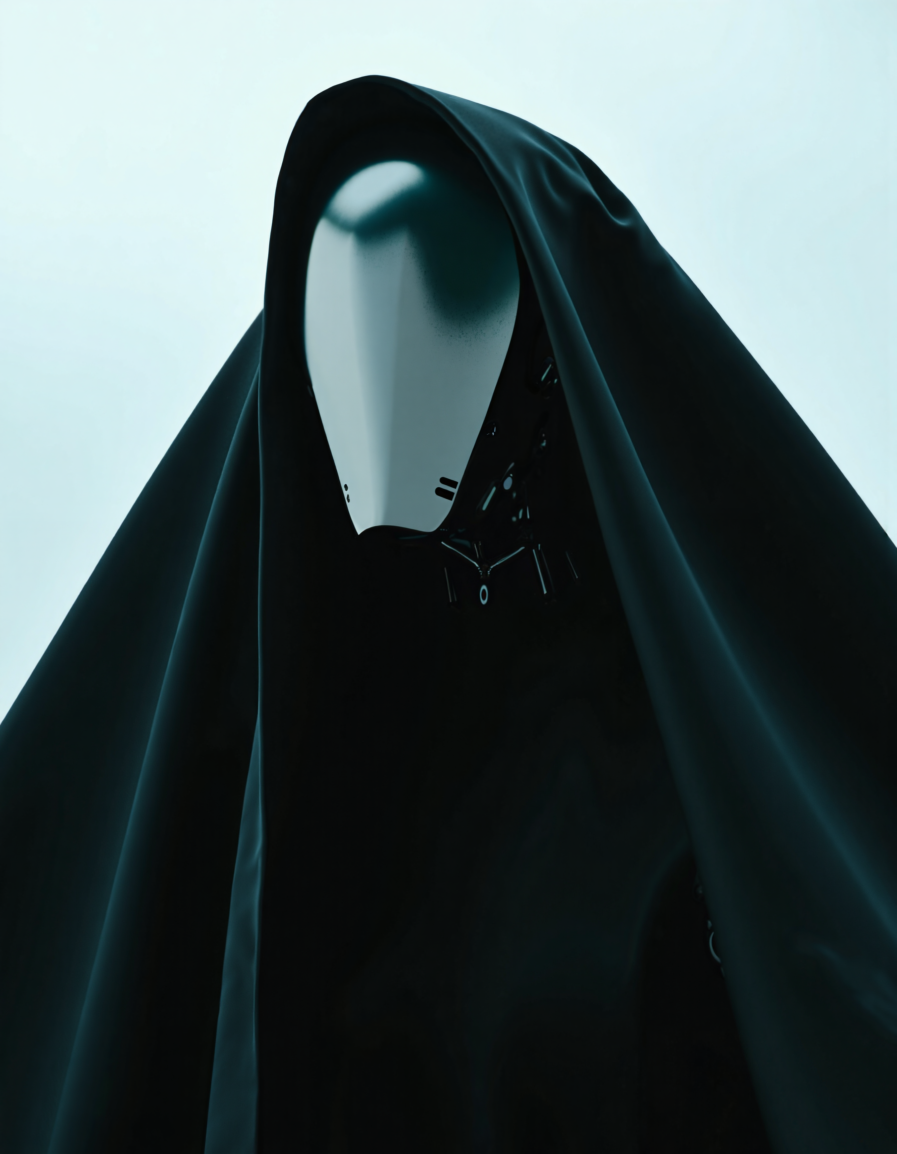 UNI_SCI_FI The image presents a sleek, mysterious robotic figure, draped in a flowing black hood. With an exquisite glossy finish, the head reflects light delicately, creating an entrancing effect. The soft, minimalistic background enhances the subject’s futuristic charm, inviting viewers to ponder the blend of technology and artistry. The atmosphere is both serene and thought-provoking, embodying an innovative Midjourney style that evokes feelings of curiosity and awe. The interplay of shadows and highlights adds depth, emphasizing the unique design. This artwork is a beautiful depiction of modern aesthetics and futuristic themes.