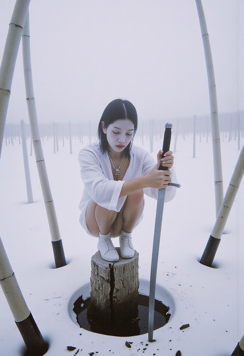 ibsukionsen, masterpiece, newest, absurdres, very awa, 1girl, crouching, action pose, holding sword, perched on bamboo stump, recursion, too many bamboo, white bamboo, intricate detail, iridescent, abstract background, bamboo forest, cut bamboo, flat composition, limited palette, pale white and blue, fisheye, perspective, depth, outdoors, binary, snow, frozen, frost, dutch angle, XUER guangying, r17329_illu, 4ki4k4ne_illu, ambient occlusion, neon-mist, 90s Tokyo erotica, garment made of plastic similar to a raincoat, jewelry. 90s, 90STOKYO, low light, grainy, visible noise, reflections