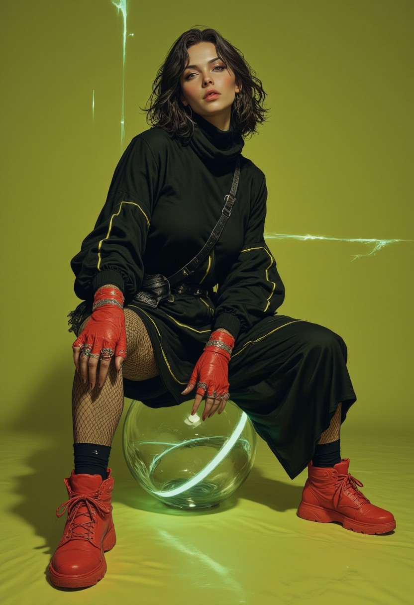 (illustration, By Phandigrams) A full-body fine art photography shot in "zavy-fnrt" style, with an "anime cyberpunk mythp0rt" aesthetic, featuring a beautiful adult woman. The straight, low-angle shot focuses on her, presenting her in high-quality, using the "aidmaimageupgrader" for impeccable clarity. She is dressed in oversized loose asymmetrical avant-garde black clothing with 3 cm thick fluorescent green lines, offering a surreal urban avant-garde look. Her outfit includes a perfect black asymmetrical skirt paired with netted stockings and oversized red sneaker boots. She also wears a loose black turtleneck and carries an urban sling bag, complementing the futuristic style. Her "Perfect hand" is flawless, with no extra fingers or deformations, and it’s adorned with futuristic neon-glowing bangles. She wears red winter gloves that match her sneakers perfectly, tying the look together. She sits elegantly on a transparent crystal sphere, which reflects light highlights and has an iridescent tint, capturing a realistic yet aesthetic pose. The background is olive green, subtly enhanced by neon lines that add to the cyberpunk atmosphere. The image is shot in 8K resolution, ensuring it is of the highest quality and detail, making it a contender for "best Fashion photo of the year" with its masterpiece-level execution and stunning visual impact.