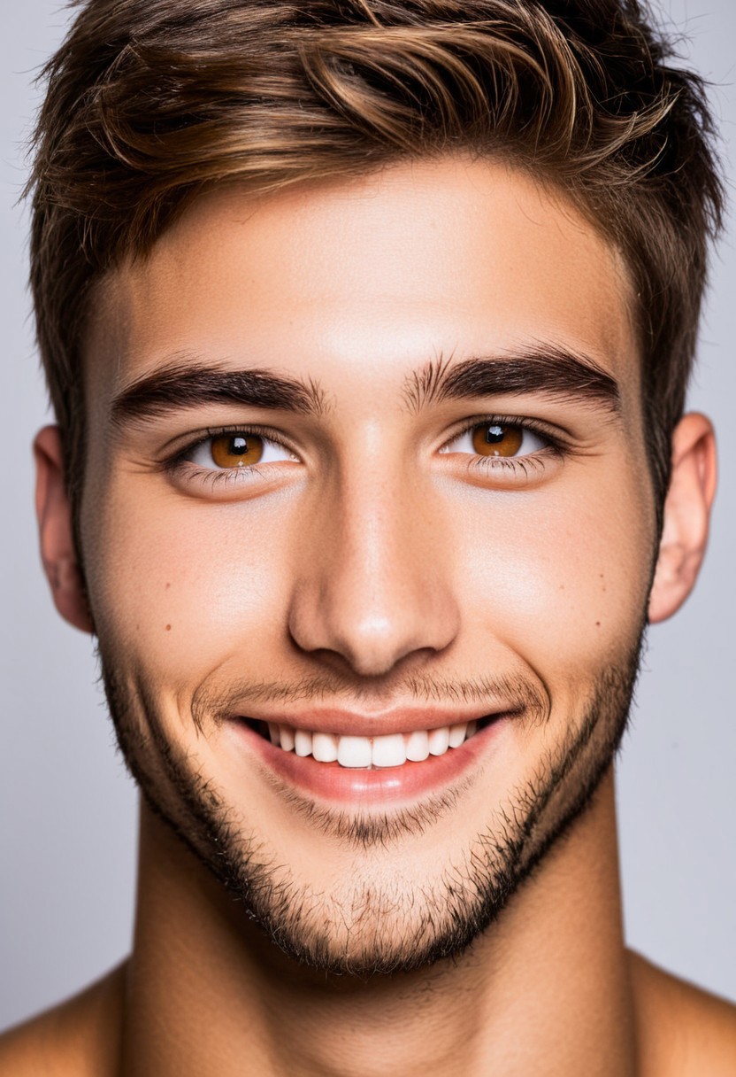 handsome 25 yo male model, hazel eyes, naughty smile, headshot, college, close up, skin details, fashion photoshooting, hyperdetailed photography, looking at viewer
