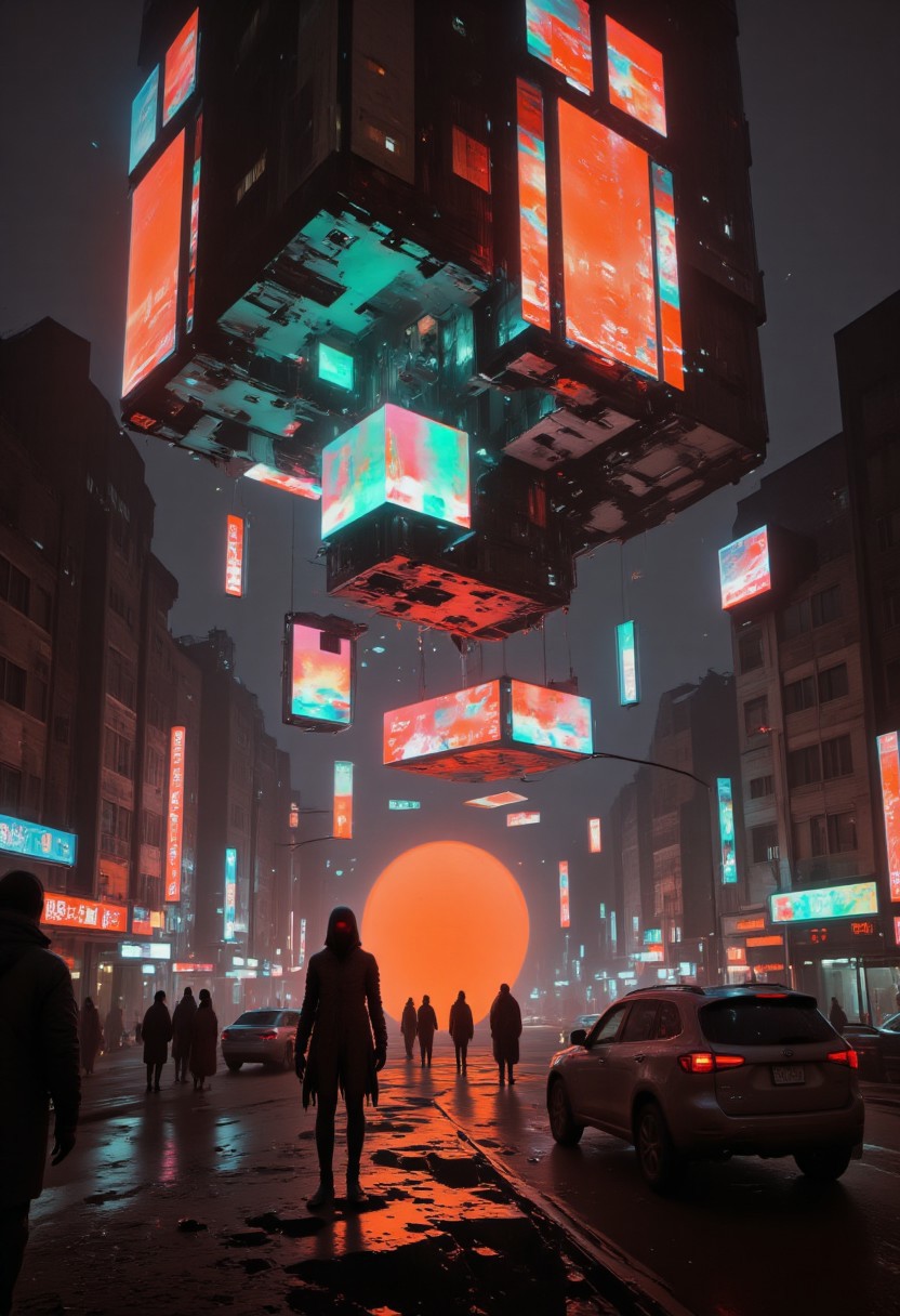 Floating Chaos, buildings, cars, people, nothing obeys gravity anymore. They hover, weightless, like forgotten memories. gantz-advancedsuit, osaka \(city\), doutonbori, midnight, neon sign, gantz advanced suit, orange sphere in background, highly detailed, high budget, cinemascope, moody, epic, gorgeous, film grain, grainy, Jagged rips in space-time, pulsating with the sickly glow of neon orange, electric blue, or radioactive green, synthetic mist, hiding secrets, silhouettes, and the occasional ghost of the old world. pscho_4rt, surreal, abstract, glitch effects
