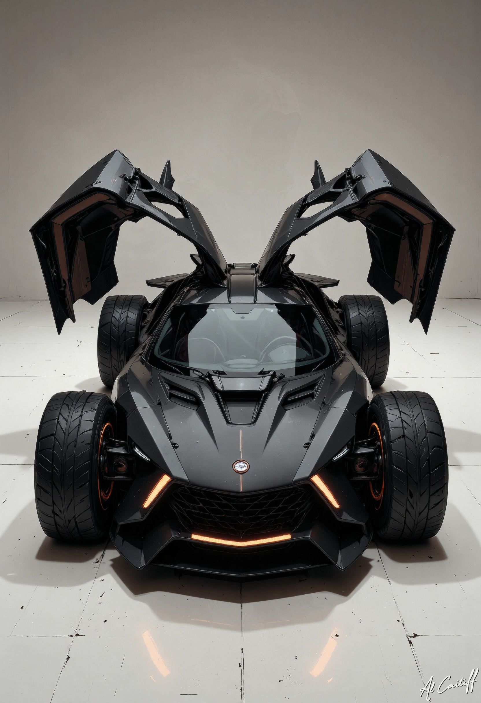 High-angle shot, 35mm telephoto lens with slight barrel distortion, minimal motion blur, and a deep f/4 depth of field. A sleek, futuristic sports car with a matte black finish, angular lines, and a gull-wing door design is centered in a minimalist, neutral-colored studio environment. The car's aerodynamic body seems to be sculpted from a single piece of metal, with a subtle curve of the hood and a dramatic slope of the rear windshield. Its wheels are massive and feature a unique, copper-colored hub design. The car's interior is not visible, but a subtle LED strip on the front fascia glows with a warm, orange-red light. The overall aesthetic is one of cutting-edge technology and futuristic design, with a focus on clean lines and minimal ornamentation., Niji Stan Katayama Style, CreeepyCuteMagic<lora:CustomFlux/MysticComic-v2.safetensors:0.5000000000000001:0.5000000000000001> <lora:Flux/Niji_B_anime.safetensors:0.5000000000000001:0.5000000000000001> <lora:Flux/creeepycutemagic-000012 - version ER.safetensors:0.5000000000000001:0.5000000000000001>