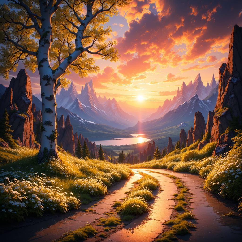 A golden road winds through a misty valley towards towering mountains surrounding a large lake. snow still cling heavy to the Mountains. The setting sun goes below the horizon, painting the sky in vivid hues of red, orange, and gold. Ancient white birch trees line the path, their spring green leaves going so sleep in the dusks light, petals glowing with an ethereal radiance. Dew-kissed grass sparkles as sunbeams dance across the landscape. patches of snow is melting under the birches. Wispy clouds catch the evening light, transforming into floating islands of color. In the distance, the mountains' peaks submerge in shadow, their crystal spires glinting in the day's brilliance. As the world stirs to life, luminous white flowers curl up along the roadside, their soft glow harmonizing with the green leaves.