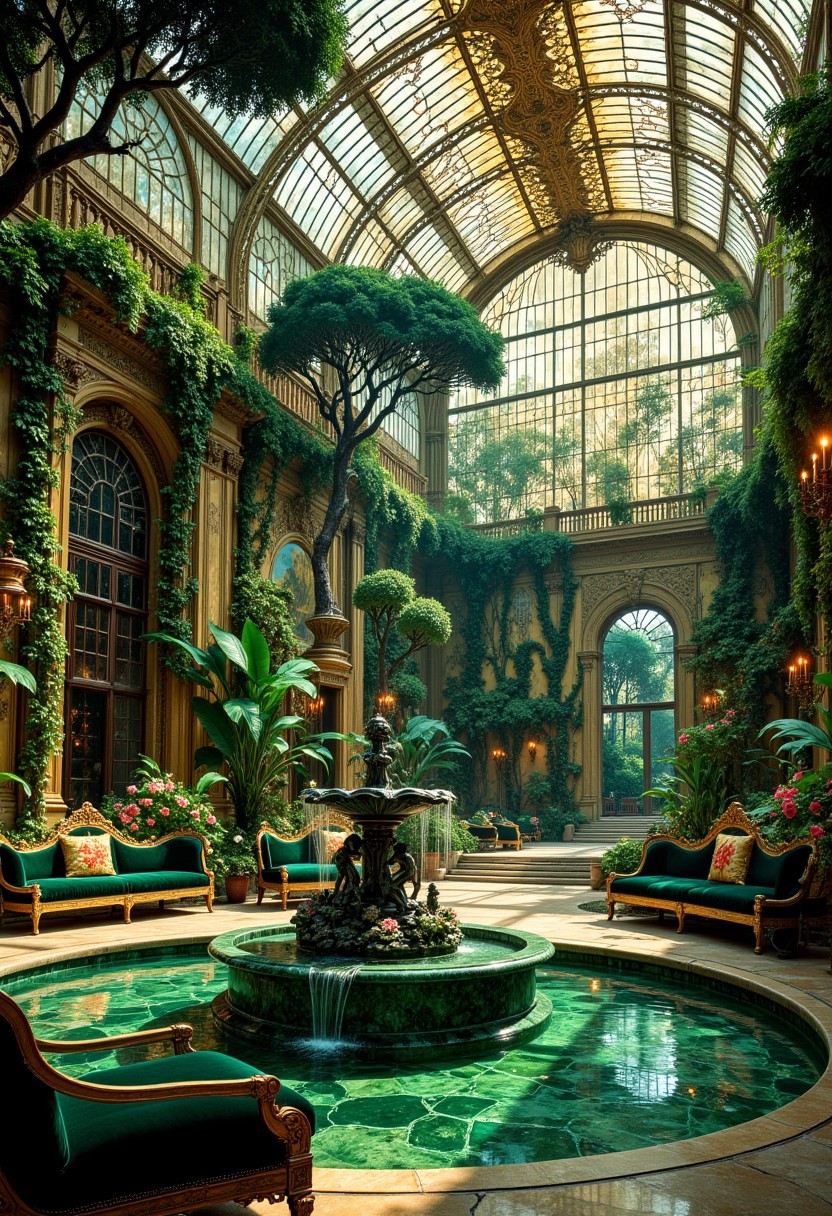 Art Nouveau Glasshouse Ballroom with Flowing Floral Motifs A vast Art Nouveau ballroom, enclosed within a stunning stained-glass greenhouse, where sinuous metalwork forms intricate floral and vine patterns along the arched ceiling. The glass panels shimmer in hues of emerald, amber, and sapphire, casting a mesmerizing glow over the botanical paradise inside. At the center, a fountain carved from green marble features nymph-like sculptures entwined with bronze vines, water flowing gently over its edges. The seating area is adorned with velvet chaise lounges in deep forest green and gold, with curved, hand-carved wooden frames resembling blooming flowers. The walls are decorated with large, swirling floral murals, reminiscent of Alphonse Mucha’s artwork, while ornate brass candelabras with twisting vines and blooming lilies provide soft, golden lighting. Massive indoor trees, climbing ivy, and cascading orchids create an immersive, almost mystical, botanical escape. The atmosphere is romantic, dreamy, and intricately artistic—a place where nature and Art Nouveau design merge seamlessly.