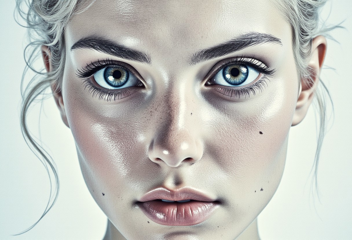 A closeup, surreal, ethereal portrait of a woman with a hauntingly beautiful, almost angelic presence. Her pale complexion is luminescent, blending seamlessly into the pure white background, creating an impression that she is emerging from light itself. Her very large piercing blue eyes are the focal point, their crystalline clarity and soft glow conveying a sense of otherworldly wisdom and calm. Her long lashes are bold and dramatic, contrasting starkly against her porcelain skin, drawing the viewer's gaze deeper into her haunting stare. Her features are delicately sculpted, with high cheekbones, a perfectly straight nose, and soft, full lips that hold a subtle, neutral expression, suggesting serenity and quiet strength. Her platinum-white hair flows and floats softly upwards, emphasizing her celestial appearance. The fine strands are light and wispy, blending seamlessly into the white backdrop with white ashes falling around her, adding to the ethereal atmosphere. The lighting is diffused and even, erasing shadows and creating a minimalistic aesthetic that places full focus on her striking features. The overall composition feels timeless, as if capturing the essence of purity and perfection, with a soft, dreamlike quality that invites introspection and awe. The simplicity of the image enhances its mystique, creating a profound, angelic presence that feels both familiar and otherworldly.