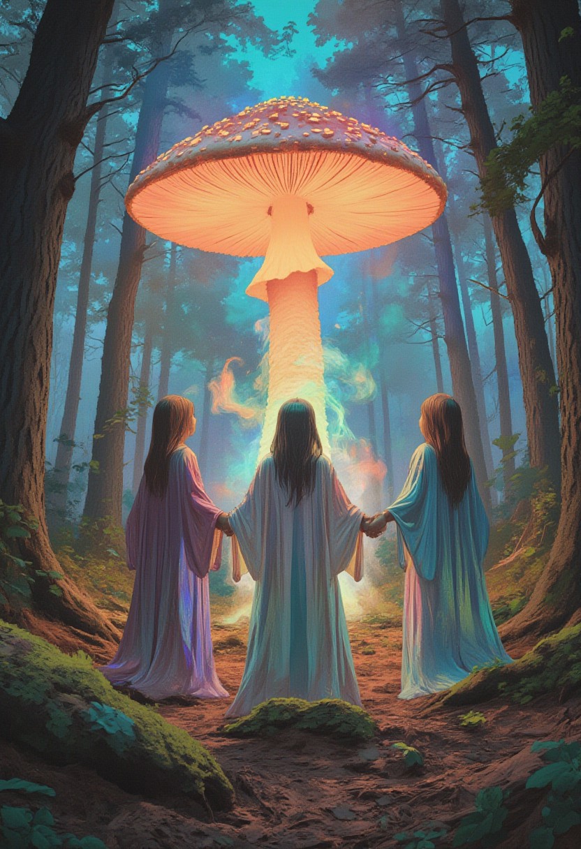 comic art by Mike Allred, A dreamlike forest clearing bathed in a soft, pastel light. In the center, a large, glowing mushroom serves as an altar, surrounded by figures in flowing, iridescent robes. They hold hands in a circle, their eyes closed in deep concentration as wisps of colorful smoke rise from the ground., in the style of decaying animatronic, claymation, VHS screen grab, grainy, old footage, in the style of an old 80's VHS dark fantasy, VHS screen grab, grainy, old footage art by torikun, SentinelBot, OBxiaoxiang