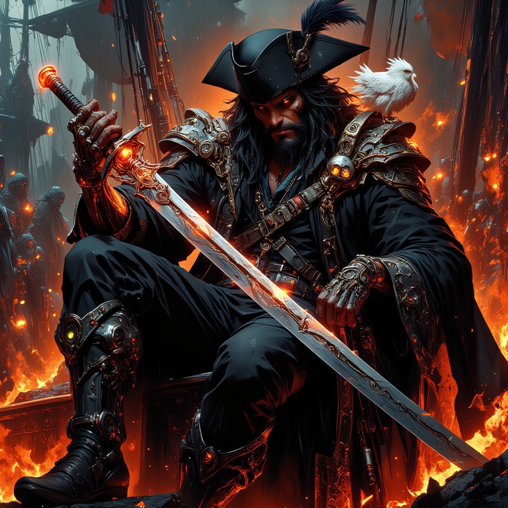 In the style of ff-td, Inkplash art on rice paper, sepia, henna , Silhouette Art, magnificent, inksplash poster art, masterpiece, best quality, amazing quality, very aesthetic, absurdres, (masterpiece), (best quality), (ultra-detailed), amazing quality, very aesthetic, illustration, perfect composition, intricate details, absurdres, incredibly absurdres, shiny skin, realistic, (1boy,) muscular, hard facial features, tall (two meters) heterochromia, (left eye light blue, right eye jade green), cut eyebrow, scar on lip, scar on the face, menacing expression, long black beard, muscular, pirate hat with plume, sits on sketch, holds a large powerful pirate sabre in his hand, sword heated to red, steaming, emonization of fire, warm. black coat, dragon skull shoulder strap, pirate body tattoos, white eagle sitting on shoulder strap, white shirt, pirate tattoos, robotic hand prosthesis arm, steampunk powerful left hand,, background pirate ship, pirate crew in background, rain, night, lamplight, glove atmosphere, epic atmosphere, 17th century, 17th century atmosphere, pirate atmosphere, detailed background, Cinematic lighting, volumetric lighting, 8k quality