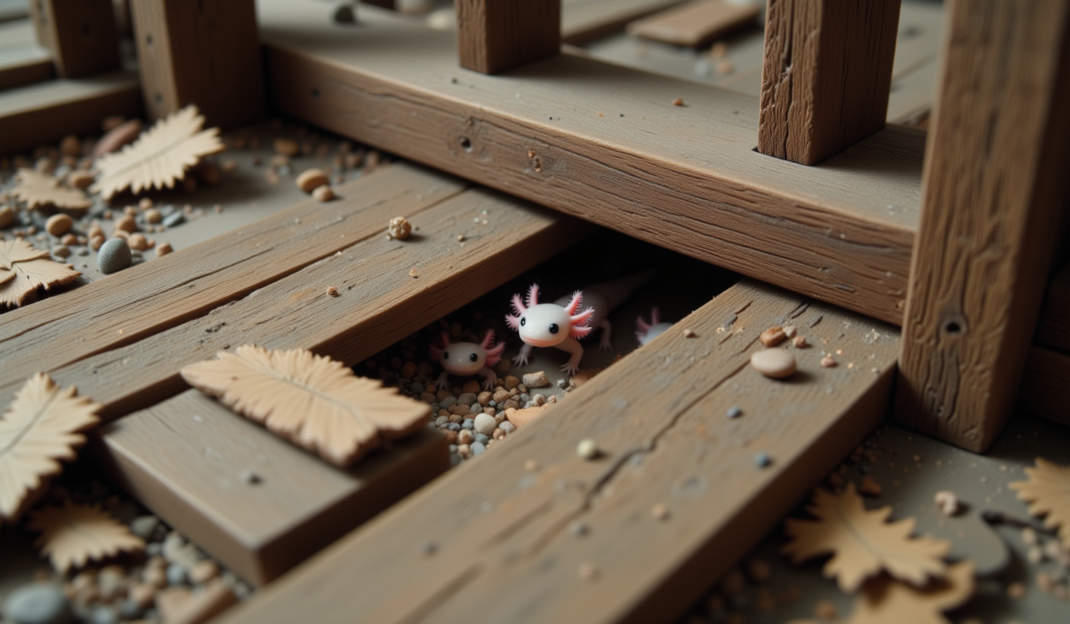 top down tilt shift image of tiny cute axolotls with pink frilly gills and round black eyes, A lone axolotl creeps through the massive cracks in the floorboards of a dilapidated house, its tiny form dwarfed by the towering wooden beams above. The gaps in the boards are wide enough for the axolotl to slip through, while the sounds of distant creaks and groans fill the air. Overhead, a colossal, unseen figure drags its heavy feet, causing dust to fall in thick clouds from the ceiling. The axolotlâs frills flutter as it cautiously peers through the cracks, fully aware that even a glance from the giant above could spell doom.<lora:Axomodel_Flux_V2.safetensors:1.0:1.0> <lora:felt.safetensors:0.5:0.5>