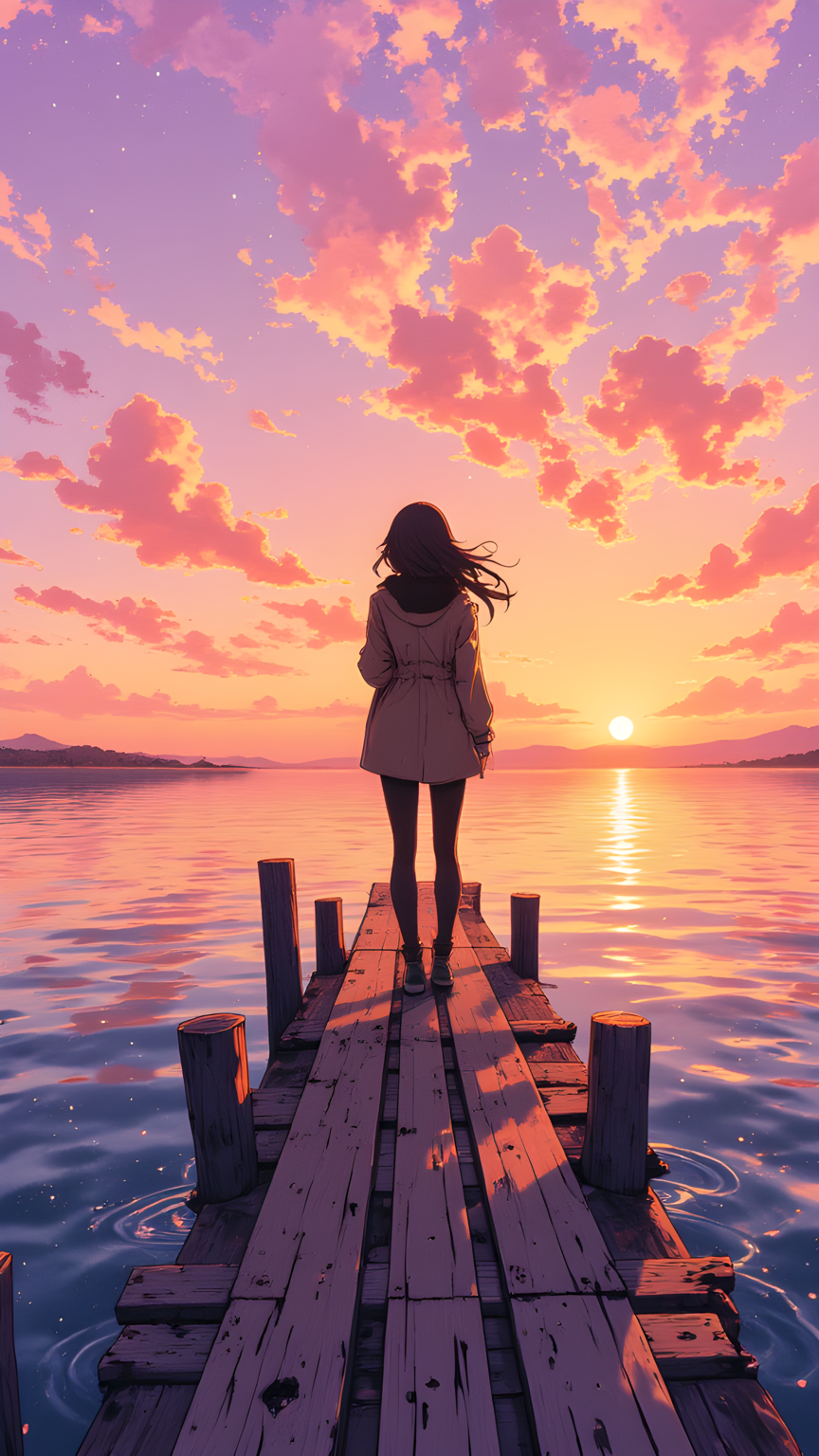 A breathtaking vision of serenity and wonder, where the sky above is painted in a kaleidoscope of vibrant hues. The horizon glows with fiery oranges and pinks, as though the sun has dipped below the water's edge, leaving behind a trail of radiant light that dances across the clouds. Above, the sky transitions into softer shades of lavender and purple, dotted with faint stars that begin to emerge as twilight deepens. At the center of this ethereal landscape stands a solitary figure, silhouetted against the brilliant backdrop. She stands on a weathered wooden pier that extends out over a calm body of water, its surface mirroring the colors of the sky like a perfect mirror. Her form is simple yet striking, her dark hair flowing loosely around her shoulders, adding a touch of movement to the otherwise still scene. She wears a coat that drapes gently over her frame, suggesting a quiet contemplation or perhaps a moment of reflection. The water beneath her is serene, its surface undisturbed except for the gentle ripples that reflect the changing colors of the sky. The pier itself is worn and rustic, its planks showing signs of age and exposure to the elements. Each board tells a story of time passing, its texture rough and uneven, yet it holds steady under her weight, connecting her to the vast expanse before her. The horizon stretches endlessly, meeting the water at a point where reality seems to blur into dream. In the distance, faint outlines of land or hills can be seen, their forms softened by the haze of the sunset. The overall atmosphere is one of profound peace, as though the world has paused for a moment, allowing the viewer to absorb the beauty of the scene. Her posture is relaxed yet deliberate, her gaze fixed on the horizon as if she is lost in thought or simply basking in the tranquility of the moment. The interplay of light and shadow creates a sense of depth, drawing the eye toward the distant horizon and the infinite possibilities it holds. It is a scene that evokes a sense of solitude and introspection, inviting the viewer to step into this tranquil world and find solace in its quiet beauty. j_art, anime, anime art, <lora:FLUX\jul\J_Anime:0.7>, <lora:FLUX\RealAnime:0.7>