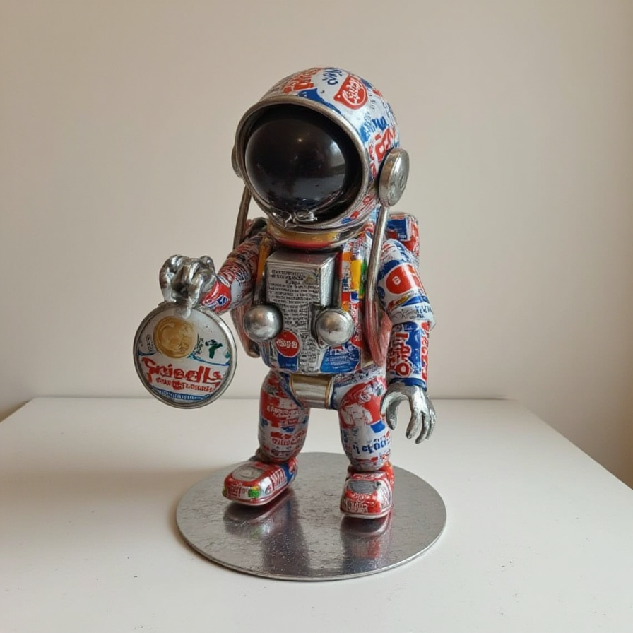 The photograph features an unusual space traveler sculpture crafted from repurposed objects, primarily plastic botles and cans <lora:ScrapArt-Flux:1>,, Cinematic photography, movie mood, cinematic light, compelling composition, storytelling elements, conveys emotion, mood, and narrative depth, creating visually striking images that feel like still frames from a film