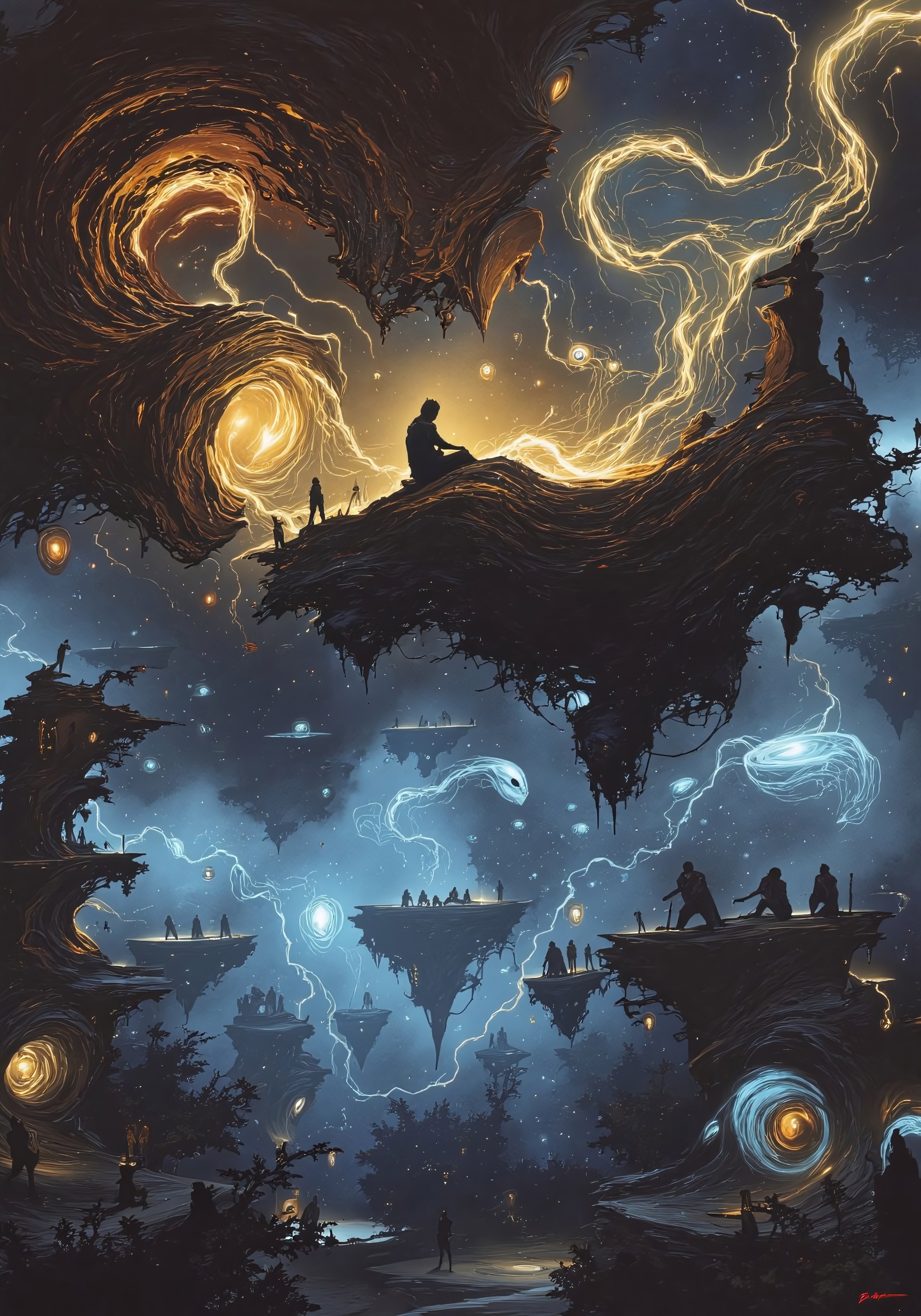 Art by Alejandro Burdisio Perched atop a hovering stone monolith that drifts between dimensions, the Cosmic Fox Prophet sits in meditative stillness, tails swirling in endless fractal patterns of ultraviolet and molten gold. His eyes glow with an unsettling intelligence, mirroring the swirling nebulae that pulse behind him. Below, a council of floating, translucent jelly-spirits hover in deep contemplation, their fluid bodies pulsing with shifting hues of cosmic energy. Bosch’s ink follows the eerie light trails left by drifting meteor fragments, which weave through ancient, rune-carved pillars suspended in zero gravity, illuminating the Prophet’s silent vision of the universe’s next great upheaval.
