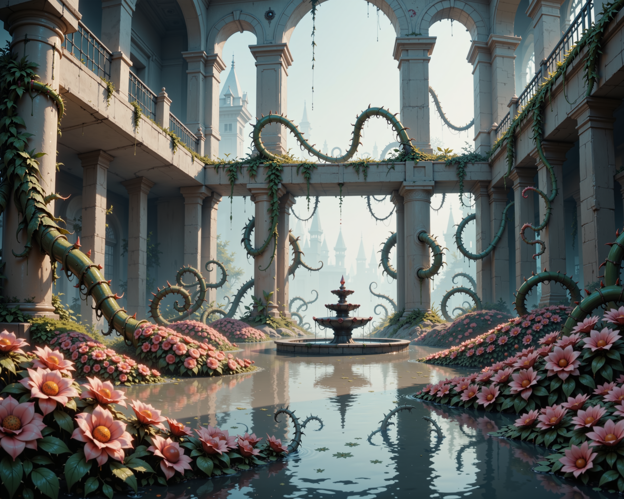 a realistic photograph of the inside of a modern hotel that has been overtaken by flowering vines with large, barbed thorns. the vines are dark green with orange and pink flowers and deep red thorns, like a rose bush. the hotel lobby had smooth black stone floors and tall glass windows, which have been broken by the vines. there is a fountain in the middle of the lobby, which is feeding the flowers.