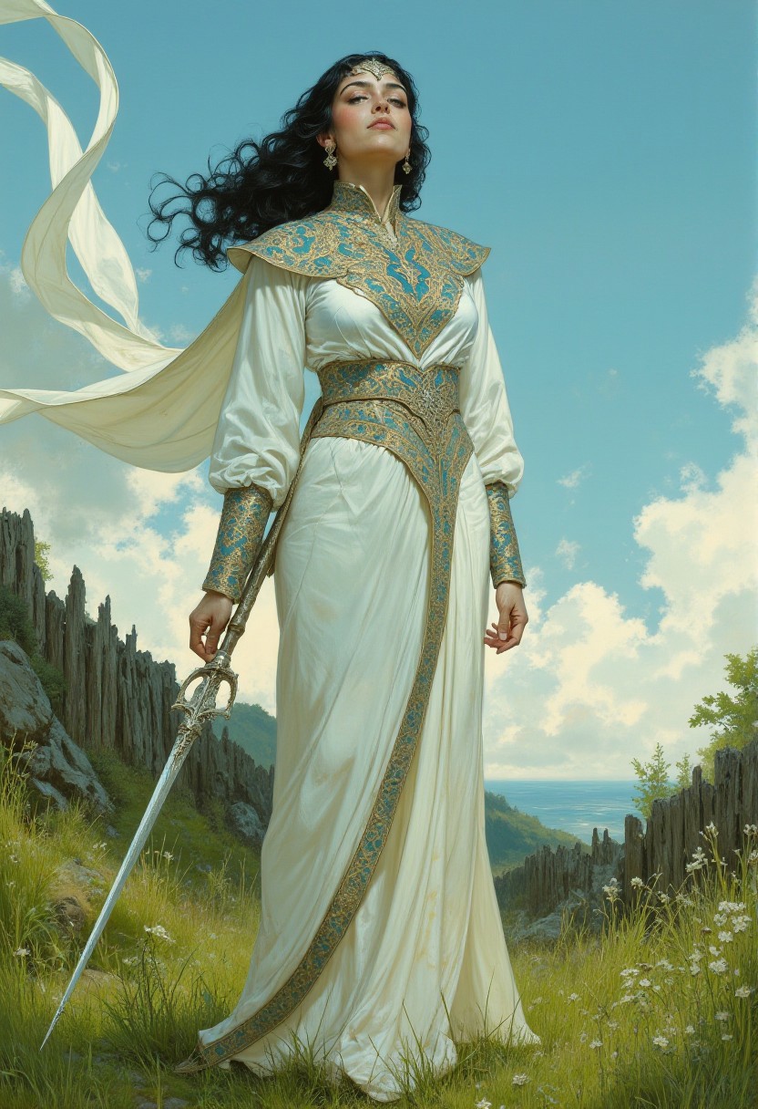 A hyper-detailed manhwa-style portrait of a striking warrior standing in a lush, scenic landscape, her long black hair flowing in the wind, soft bangs framing her sharp, elegant face. Her piercing eyes radiate strength, full red lips contrasting against flawless, sun-kissed skin. She wears a pristine white saree, its pleats cascading from her waist, while the pallu billows behind her, adorned with intricate zari embroidery. The border glistens with fine gold thread, adding regal charm. A perfectly tailored, full-sleeve blouse hugs her curvaceous frame, featuring delicate chikankari work along the sleeves and a subtle brocade pattern. The fabric clings gracefully, blending modesty with allure. She stands in garde, poised and battle-ready, exuding a seasoned warrior’s presence. Around her, lush green grass speckled with wildflowers sways in the breeze. A rustic wooden fence stretches along the horizon, partly hidden by overgrown flora. Above, a vast blue sky stretches endlessly, white clouds casting soft shadows. Sunlight filters through, illuminating the intricate details of her saree, the fine embroidery of her blouse, and the dramatic motion of her pallu. The fusion of elegance, strength, and nature creates a cinematic masterpiece of breathtaking beauty.