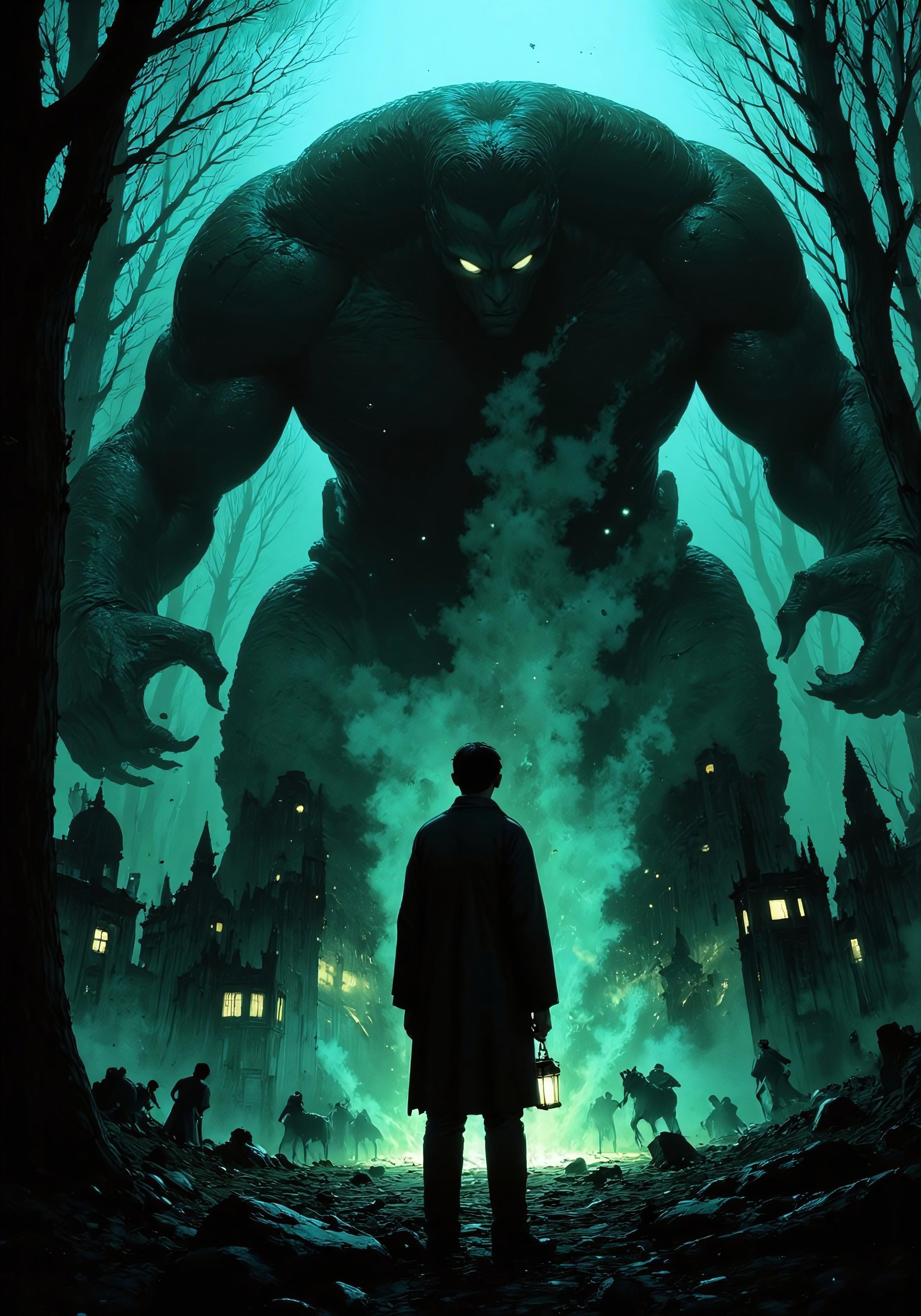 A boy, stands in a misty, dark forest. Silhouette of a boy in a dark, simple, long-sleeved coat. The boy holds a glowing lantern. Enormous, shadowy, monstrous figures loom in the fog-filled forest. Their glowing yellow eyes are prominent features, highlighting the perilous atmosphere. Deep teal-green and dark blue tones dominate the scene, creating a chilling, mysterious mood. Foggy, dense, dark forest environment. Trees in the background are silhouetted against the greenish-blue mist. Low-key lighting and strong contrast emphasize the menacing creatures and the boy vulnerability. Dramatic lighting and perspective highlight the contrast between the boy and the grotesque figures. An ominous, unsettling atmosphere pervades the image, emphasizing a fairytale-horror aesthetic. The composition is centered on the boy, juxtaposing them against the looming threats. The boy appears small and insignificant against the giant monsters. Artistic style leans towards fantasy and horror. A sense of foreboding and impending danger is evoked. Detailed silhouettes, and strong color contrast highlight the elements.
