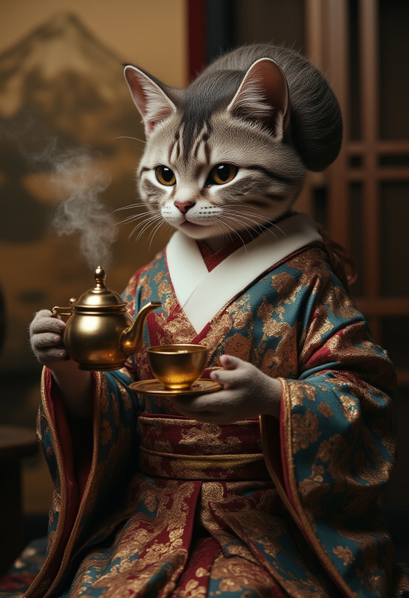 Anthropomorphic, cinematic setting, a femenine looking geisha cat wearing a lustrous high quality kimono, with a classical haircut. She iholds a teapot and pours the tea elegantly into a small teacup. The background is a traditional japanese room with a mount Fuji painting hanging on the wall. The atmosphere is decorous and ceremonial.