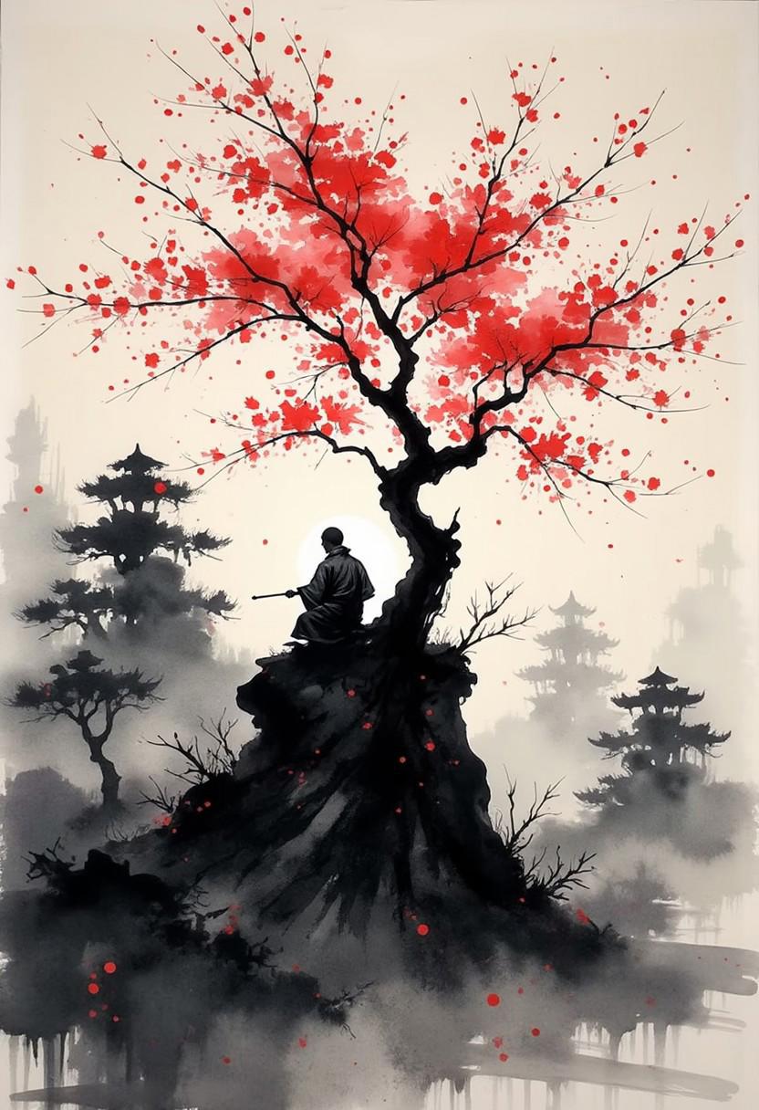 traditional Japanese art style, rice paper, grunge, ink, watercolor, Japanese mountains, a cherry blossom tree sitting on top of a large rock, by Ma Wan, cherry blossom petals blowing in wind, windy, feudal Japan, sunset, wabi-sabi, spectroscopy study of flux toroid field on spirograph etching of somatic primal scream, journey towards nucleus, resonant vibration of waves of social_consciousness, rhythm, intersubjectivity, aura electromagnetic flux field lines, emanate joy erupting from within, seated Buddhist monk silhouette at radiant pinnacle of pulsar:pinwheel, vibration repetition echoes, offset, composition thirds, vibration of universe, toroidal curvature inside subatomic electro magnetic field, imagination of self throughout whole cosmos